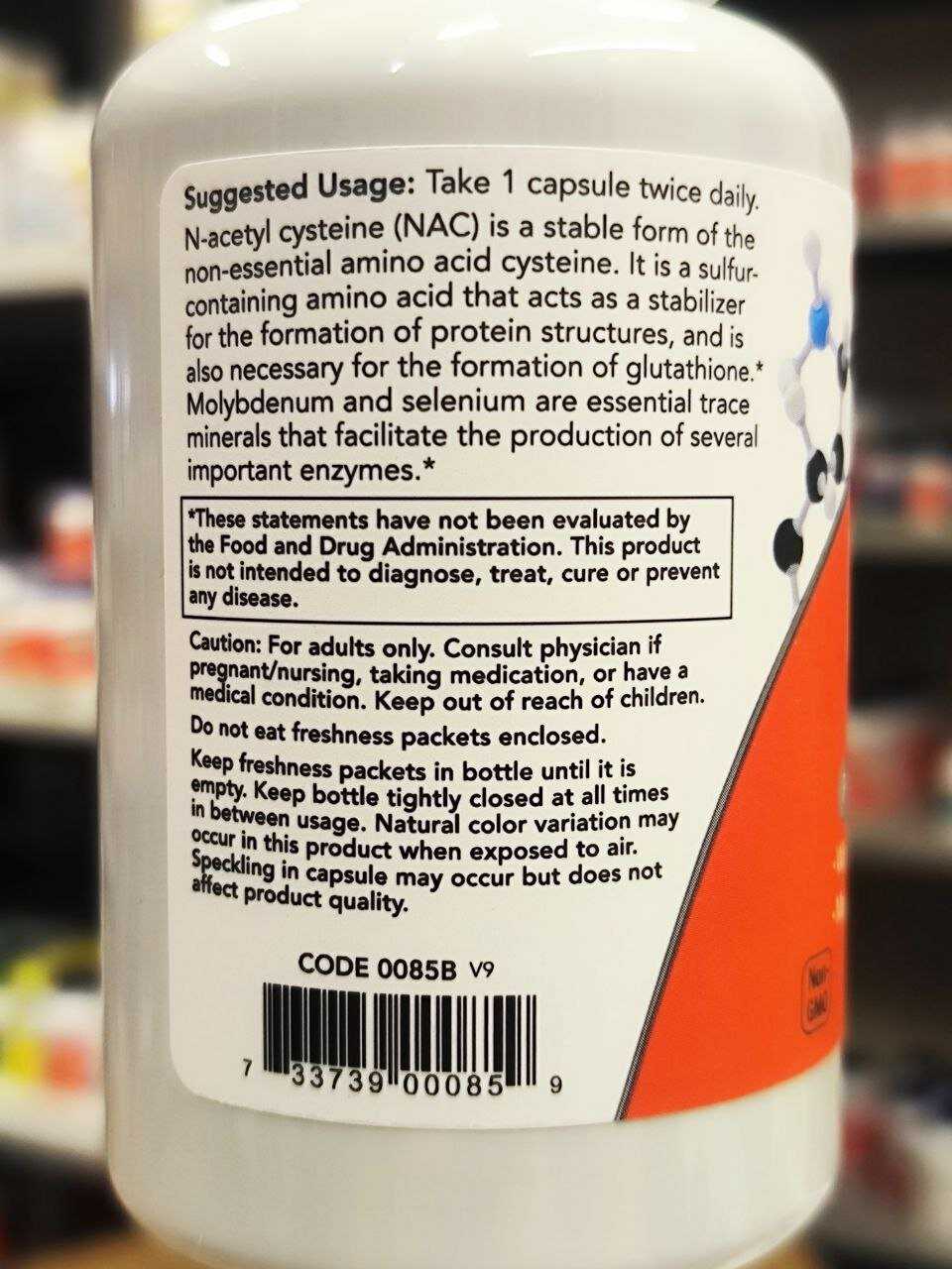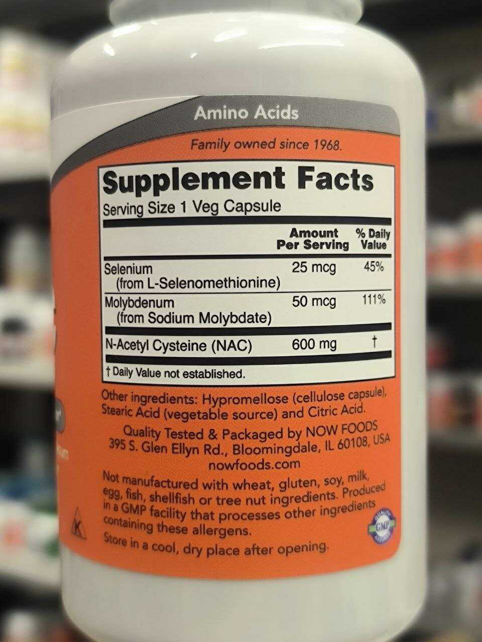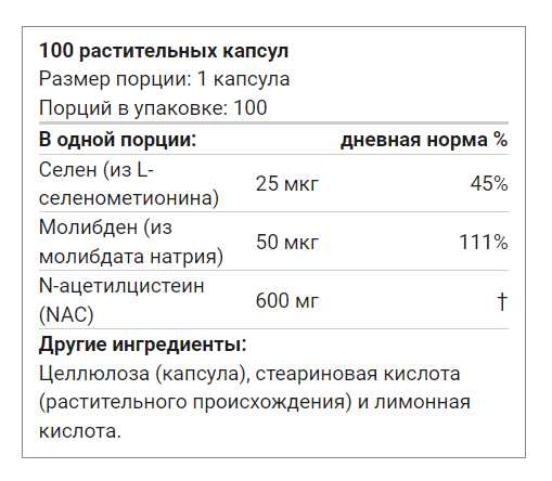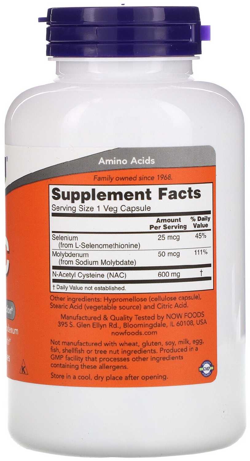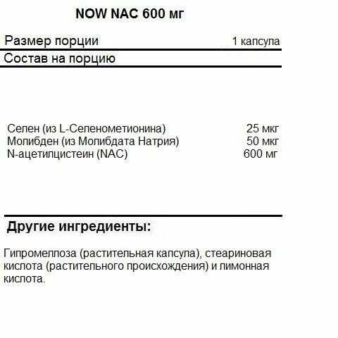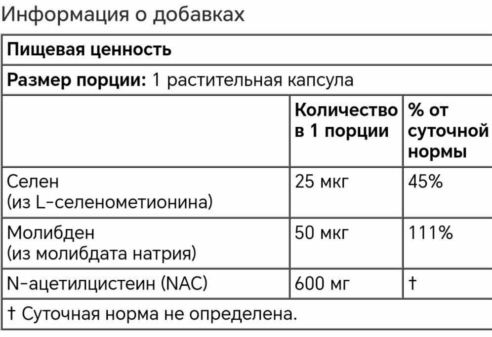 Хороший состав (NAC, молибден, селен), оптимальная дозировка (600 мг). Капсулы небольшие, никаких проблем с их проглатыванием нет. Прием 2 раза в сутки. Отличная упаковка с контролем первого вскрытия. Производство США - - Высокая цена (вдвое выше, чем год назад)