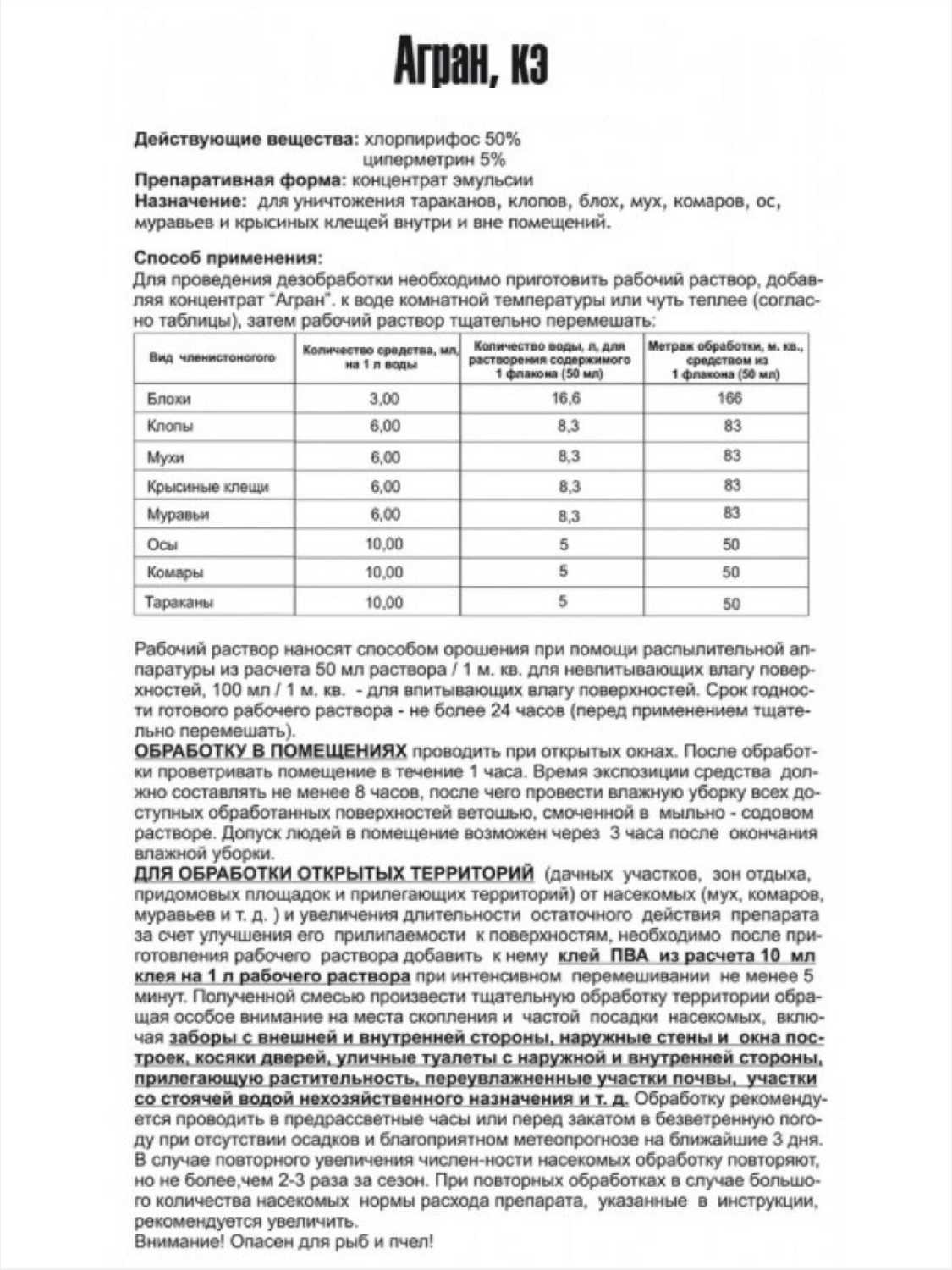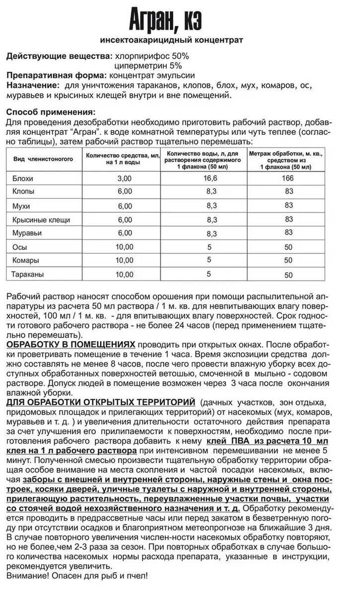 В первую очередь попробовал Агран. На 40 метровую квартиру было истрачено 3/4 флакона: все очень тщательно пролил, каждую щель. Работать надо было бы в респираторе - под конец хим.атаки начался жуткий кашель. После проветривания прошло и никаких признаков отравления не было.