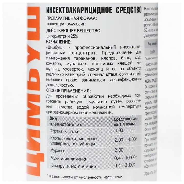Способ применения : | Для проведения обработки необходимо приготовить рабочую эмульсию путем разведения средства водой комнатной температуры при равномерном перемешивании в течение 5 минут. Наносить рабочий раствор при помощи любой распылительной аппаратуры в места обнаружения, локализации и перемещения членистоногих из расчета 100 мл/м кв на впитывающие поверхности, 50 мл/м кв – на невпитывающие. Убирают средство с обработанных рабочих поверхностей влажным способом не менее чем через 8 часов после обработки, но не позднее, чем за 3 часа до планируемого доступа людей в помещение. |