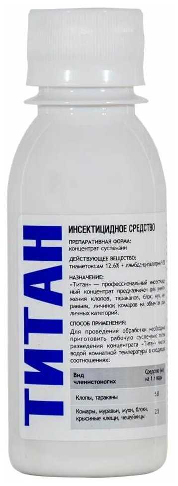 | Способ применения : | Для проведения обработки необходимо приготовить рабочую суспензию путем разведения средства «Титан» (5мл) с водой комнатной температуры (1л.), при равномерном перемешивании в течение 5 минут. Опрыскать поверхности через любую опрыскивающую аппаратуру. |