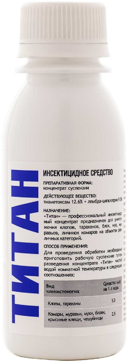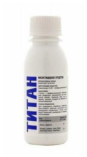 Способ применения : | Для проведения обработки необходимо приготовить рабочую суспензию путем разведения средства «Титан» (5мл) с водой комнатной температуры (1л.), при равномерном перемешивании в течение 5 минут. Опрыскать поверхности через любую опрыскивающую аппаратуру. |