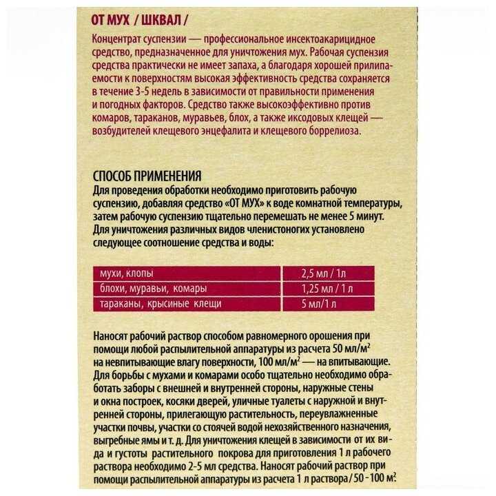 | Способ применения : | Развести в воде согласно инструкции, обработка производится из мелкого распылителя. |