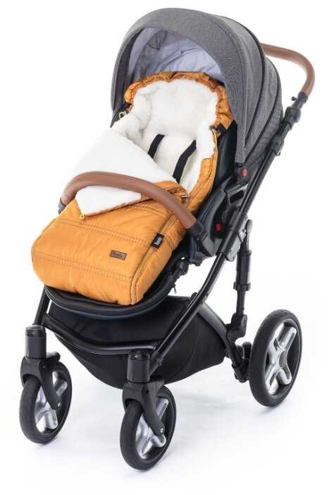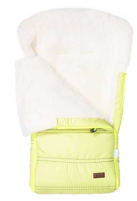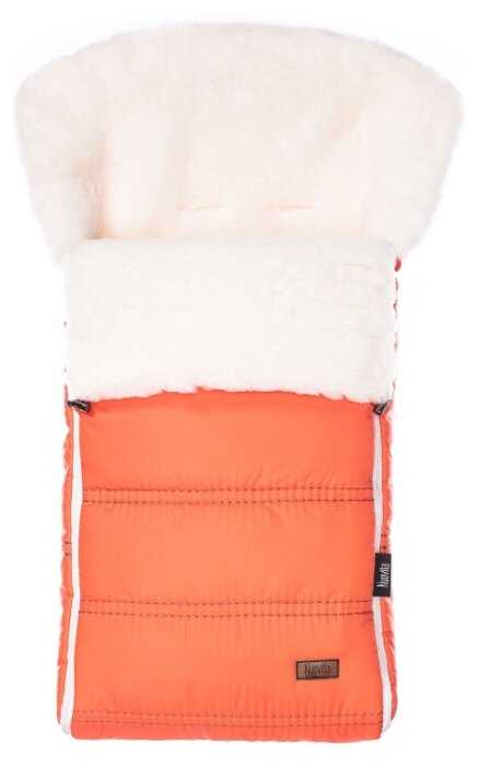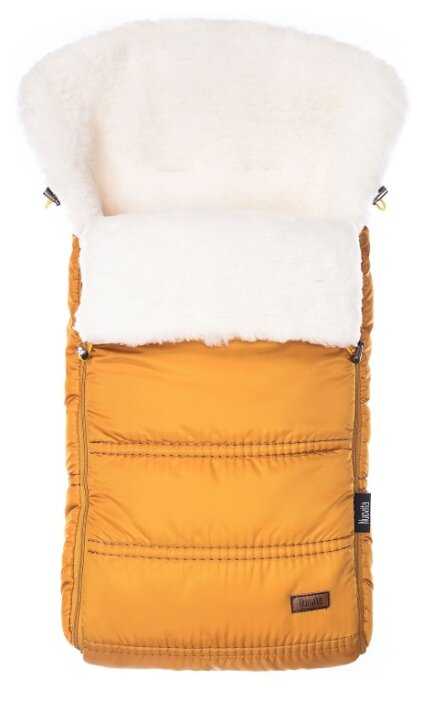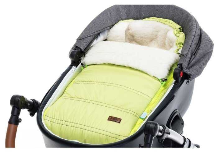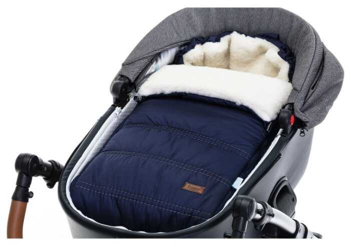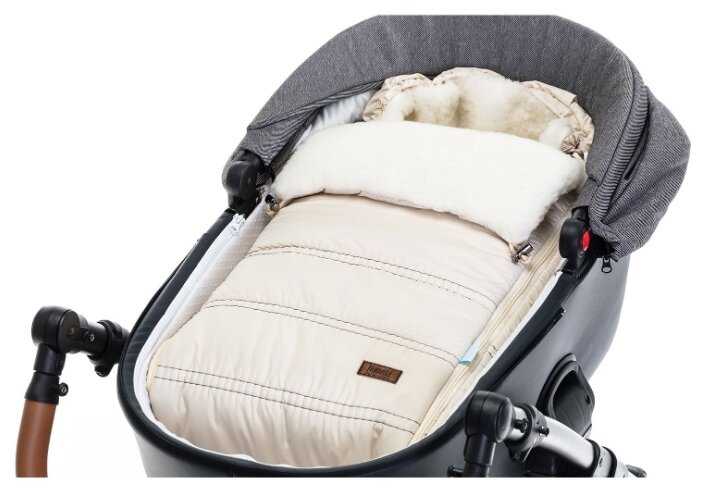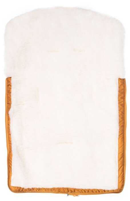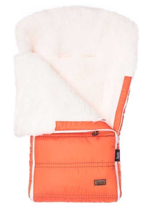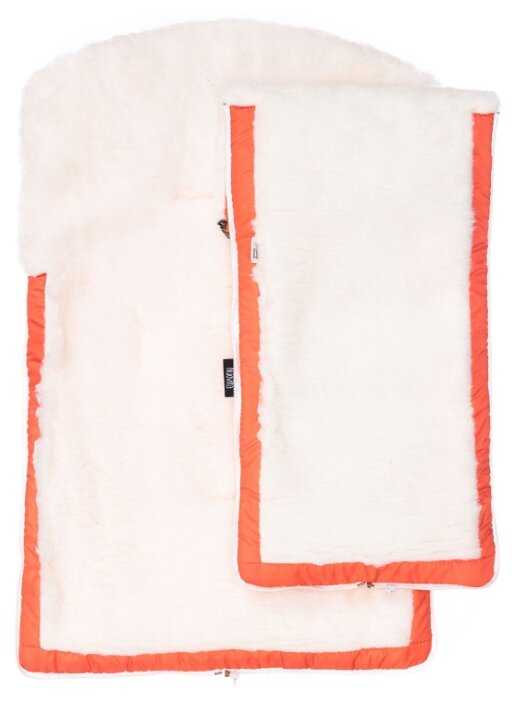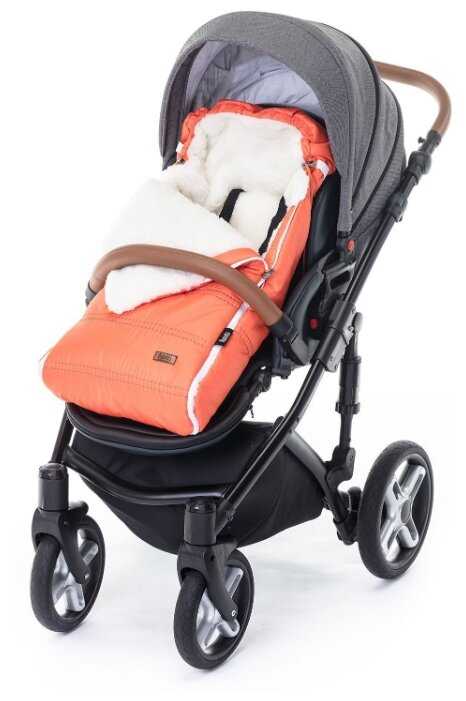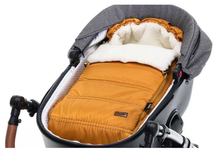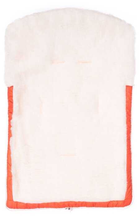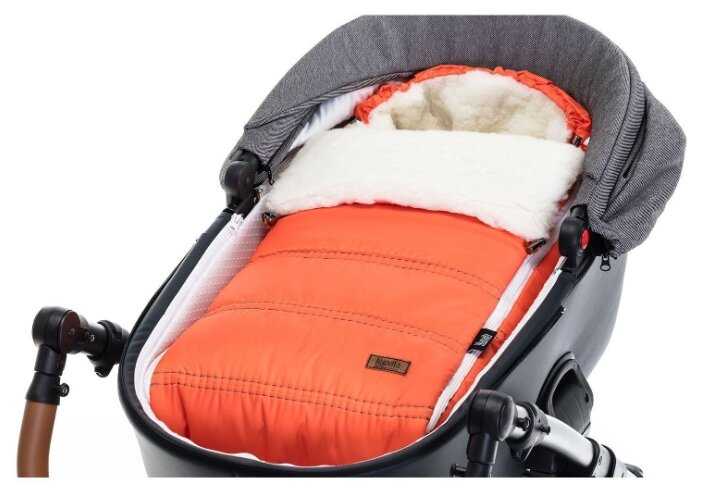 - + Очень теплый конверт на овечьей шерсти. Верх из водонепромокаемой плащевки. Есть много цветов на выбор, я взяла оранжевый, классно смотрится.