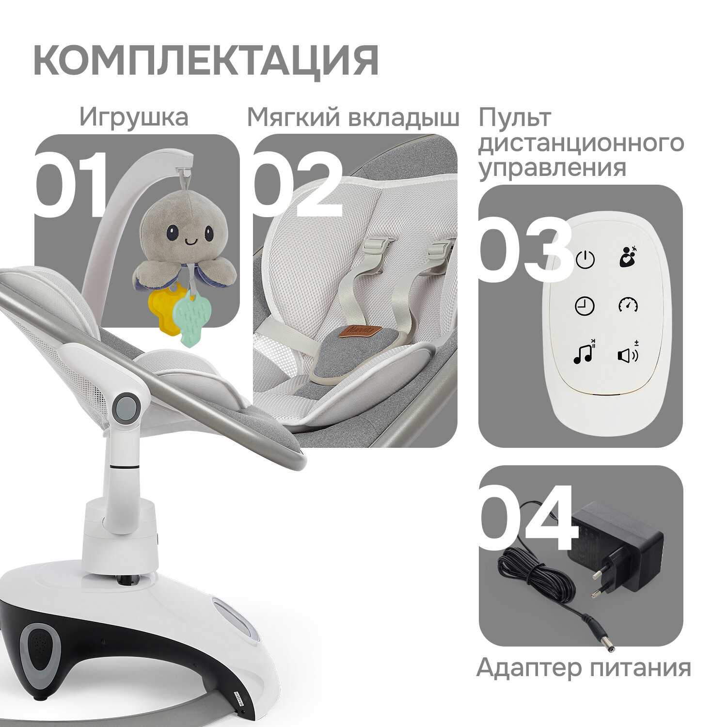 Комплектация : | электрокачель, вкладыш, адаптер питания, подвесная игрушка, пульт ДУ |
