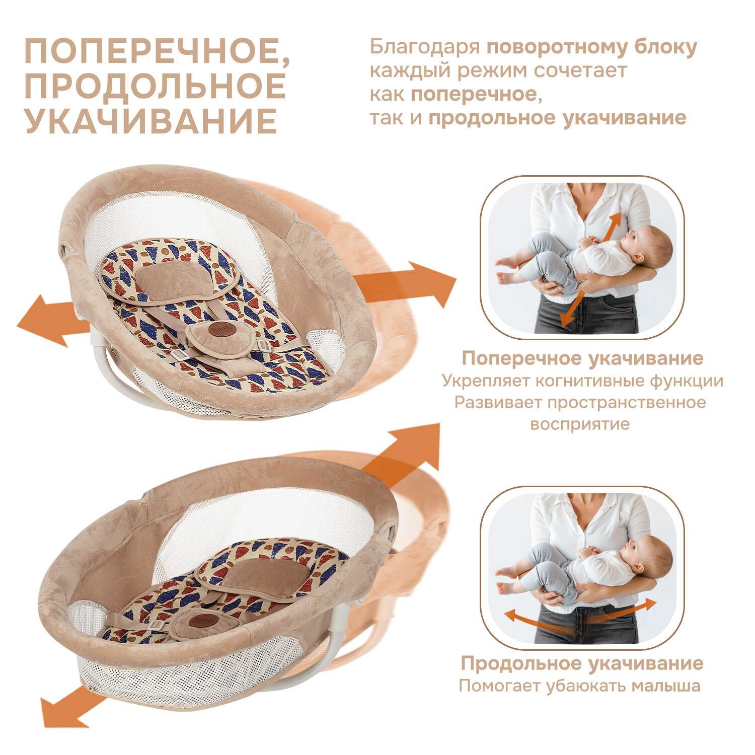 укачивает , можно подключиться к телефону и слушать музыку и т .д. ребенок лежит с удовольствием