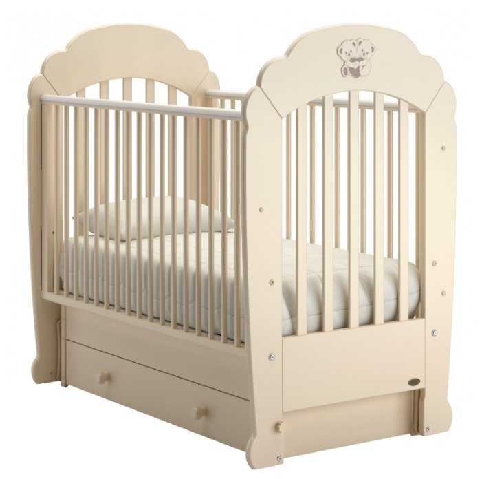 - классическая кроватка выдвижной ящик каркас из дерева и ДСП маятниковый механизм качания размеры 76x125x118 см размер матраса 60x120 см опускающаяся передняя стенка