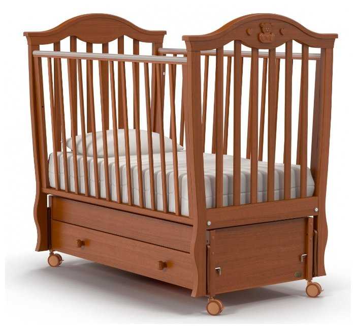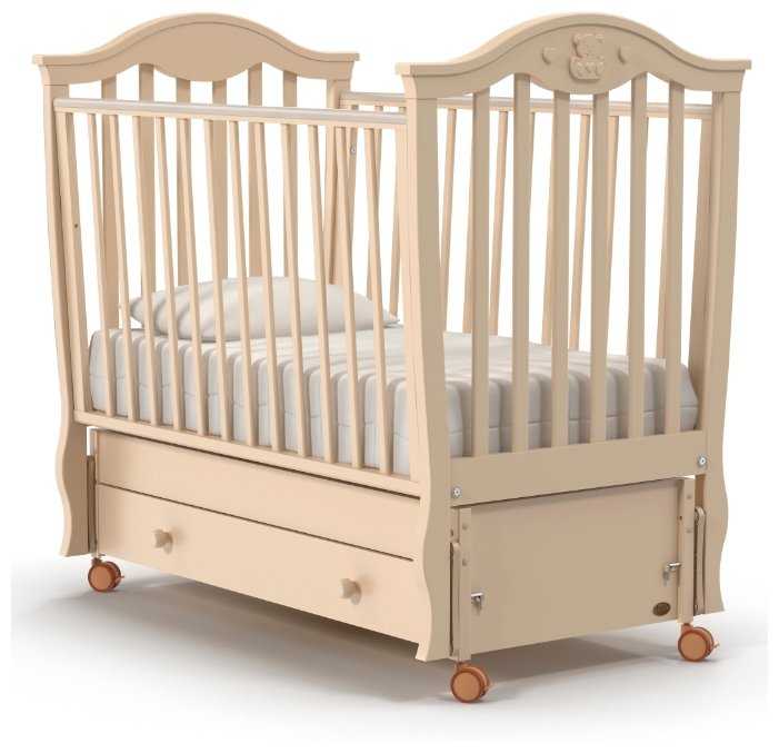 - классическая кроватка выдвижной ящик каркас из дерева и ДСП маятниковый механизм качания размеры 76x125x118 см размер матраса 60x120 см опускающаяся передняя стенка