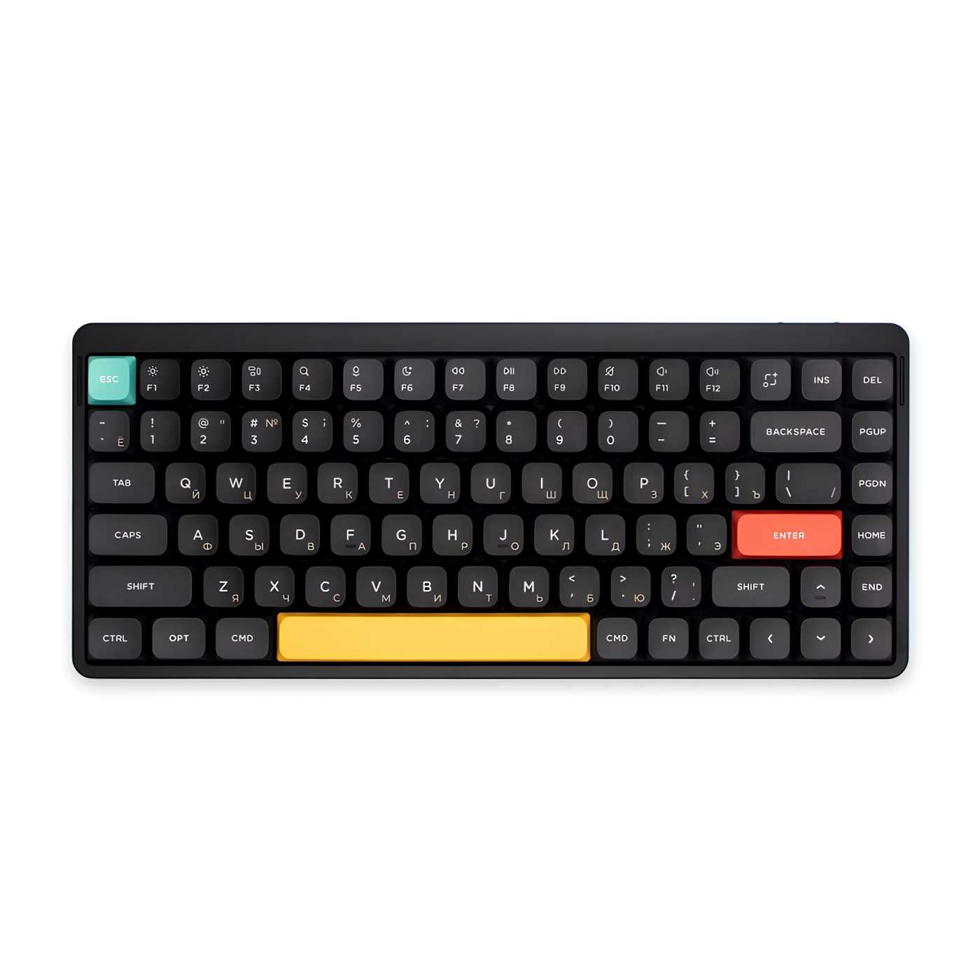 Некоторые клавиши обозначены как под Mac (например, вместо Alt тут Cmd), но положение клавиш как обычно, и у клавиатуры есть переключение между Mac/Win, поэтому проблем у обывательского пользователя возникнуть не должно