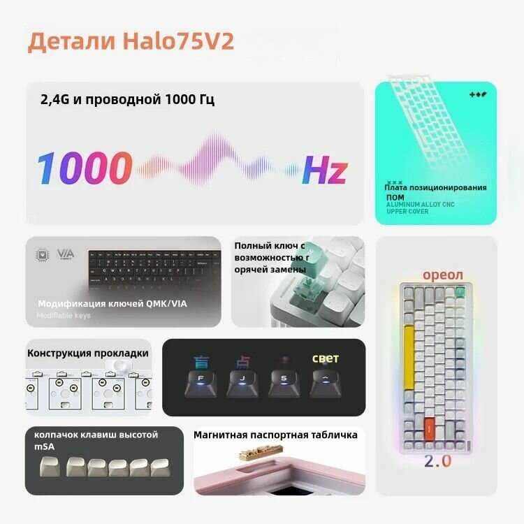 | Комплектация : | 1 x клавиатура Halo75 V2 1 x кабель 1, 5 м (59 дюймов) 1 x приемник 2, 4G 1 x съемник клавиш/переключателей 6 x дополнительных клавишных колпачков 3 x дополнительных переключателя 1 x набор наклеек 1 x краткое руководство 1 x вопросы и ответы |