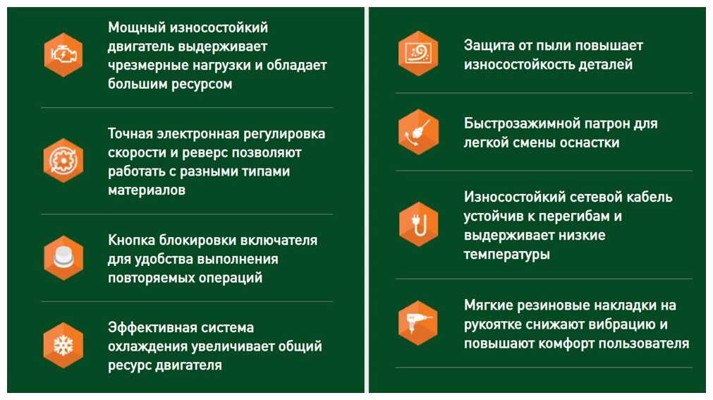 - + отличный инструмент, который справляется с бытовыми задачами без нареканий. шнур добротный и достаточной длины - 2 м. быстрозажимной патрон позволяет быстро и надёжно фиксировать сверло. несмотря на компактные размеры дрель довольно мощная. есть кнопка блокировки включения. инструмент легкий и не агревается при сверление - проверено сверлом форстнера 35мм.еще один ценный плюс - дрель очень удобно лежит в руке. в комплекте идёт пара щёток.