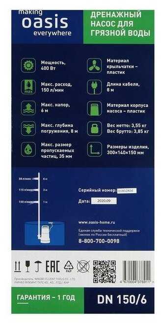 | Подробная комплектация : | Насос дренажный OASIS DV 150/6, Инструкция по эксплуатации, Упаковка. |