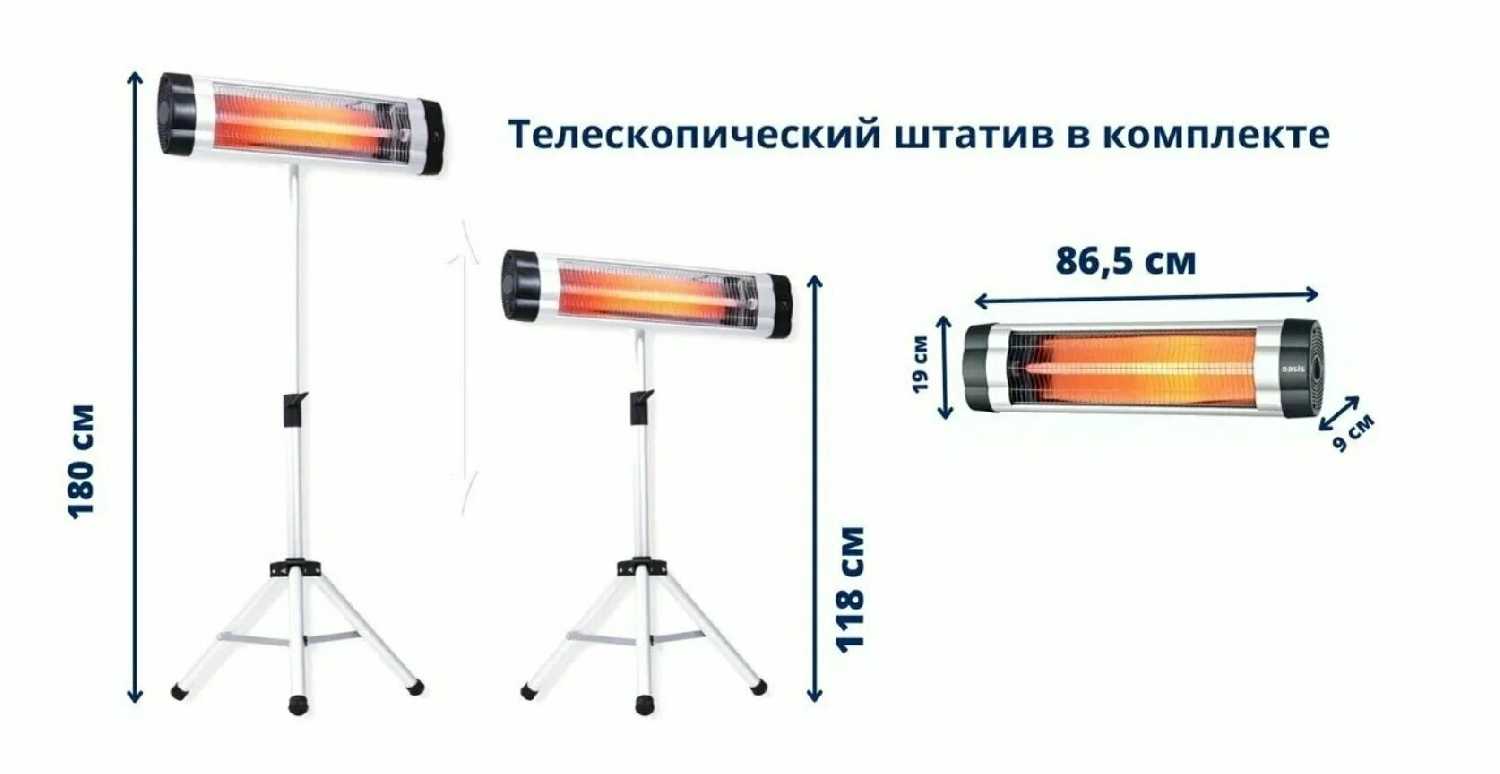 | Подробная комплектация : | инфракрасный обогреватель, комплект для настенного монтажа, телескопический штатив, руководство по эксплуатации с гарантийным талоном – 1 шт. |