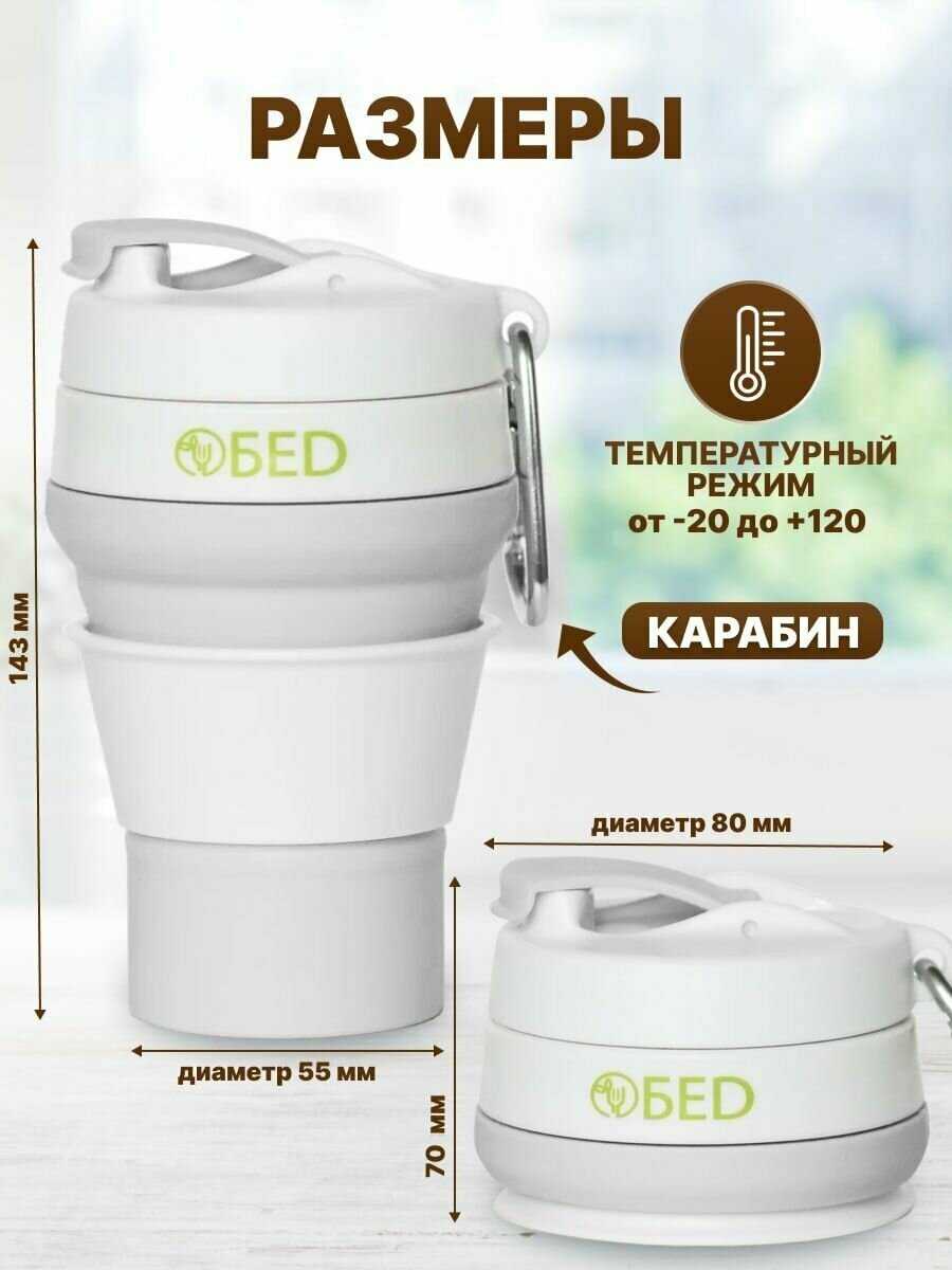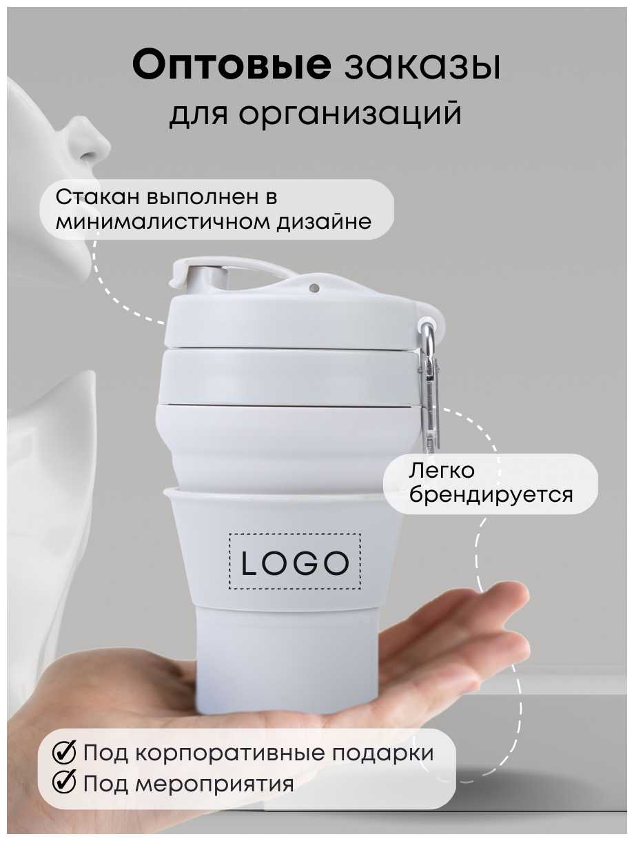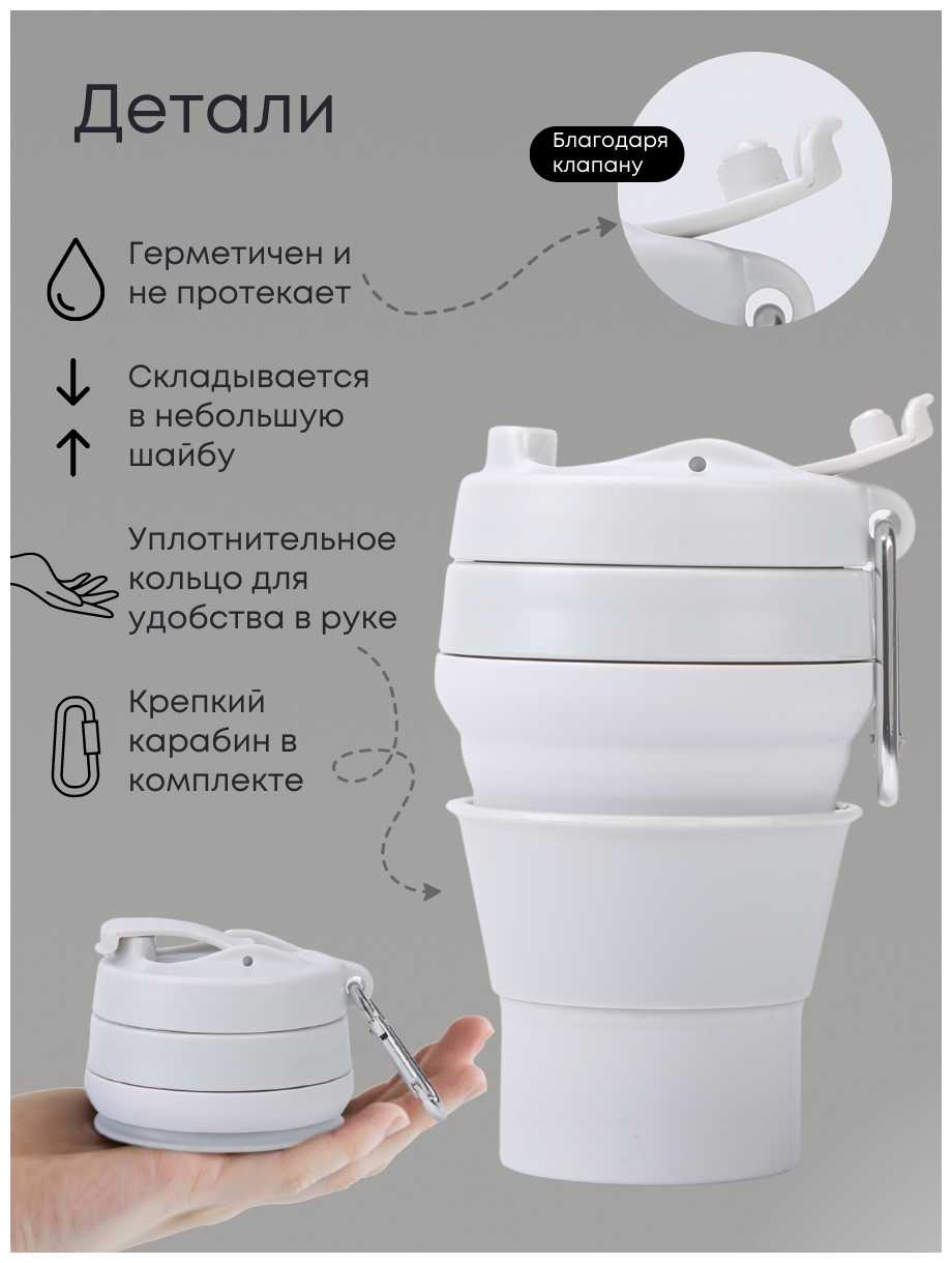 - + стакан складной силиконовый с крышкой и дозатором, запаха нету когда пьёшь горячий чай или кофе,есть карабин, удобно пользоваться, удобно мыть, объем 350мл, можно ставить в микроволновку, посудомойку, удобно брать в дорогу,стакан не проливается при закрытой крышке