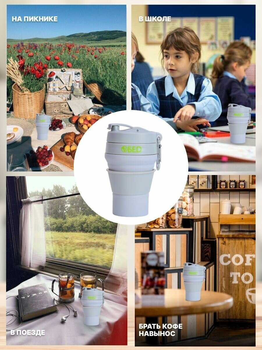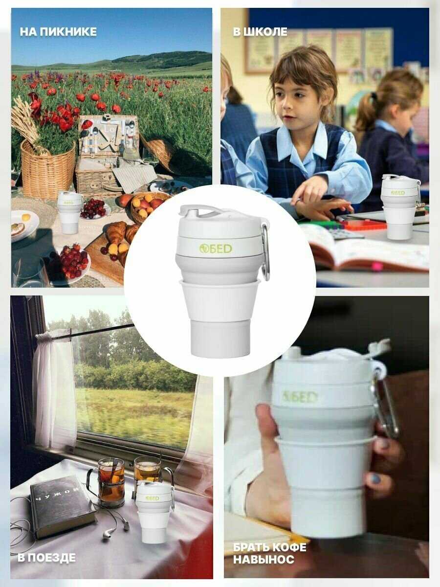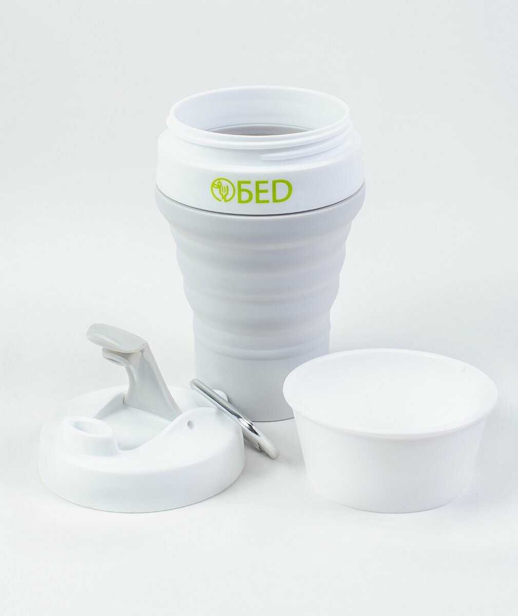 - + стакан складной силиконовый с крышкой и дозатором, запаха нету когда пьёшь горячий чай или кофе,есть карабин, удобно пользоваться, удобно мыть, объем 350мл, можно ставить в микроволновку, посудомойку, удобно брать в дорогу,стакан не проливается при закрытой крышке