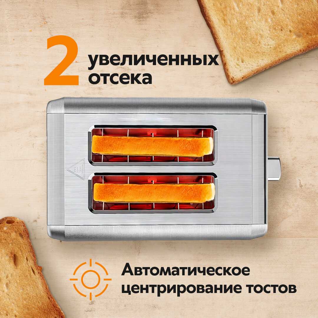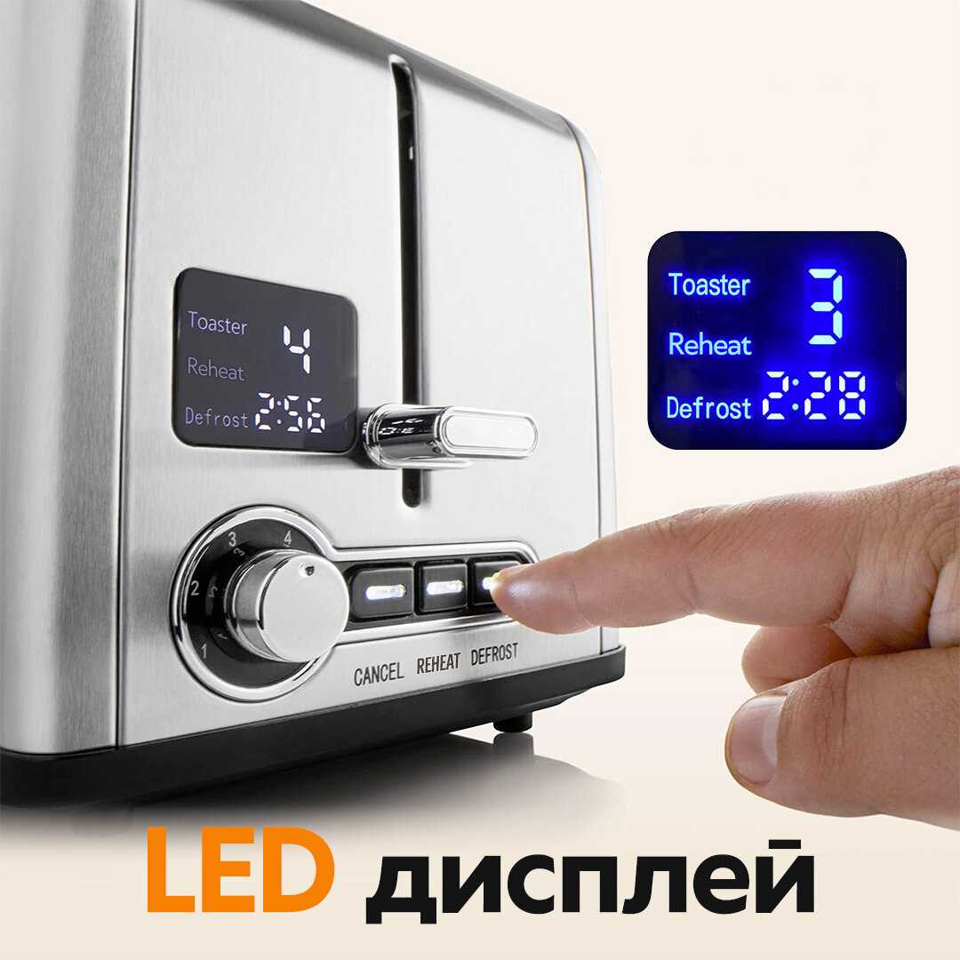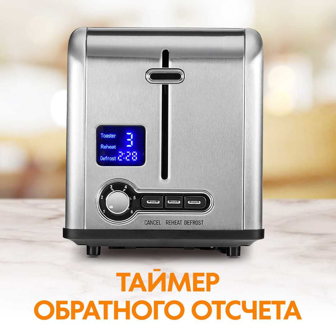 Классный тостер, лёгкий, красивый, корпус из нержавейки. Брали специально для сына 7 лет, он очень хотел готовить завтра самостоятельно, разобрался как пользоваться за несколько секунд, все просто, удобно. Хлеб вкусный, на дисплеи видно сколько минут надо подождать. Нам очень нравится, сын вообще в восторге.