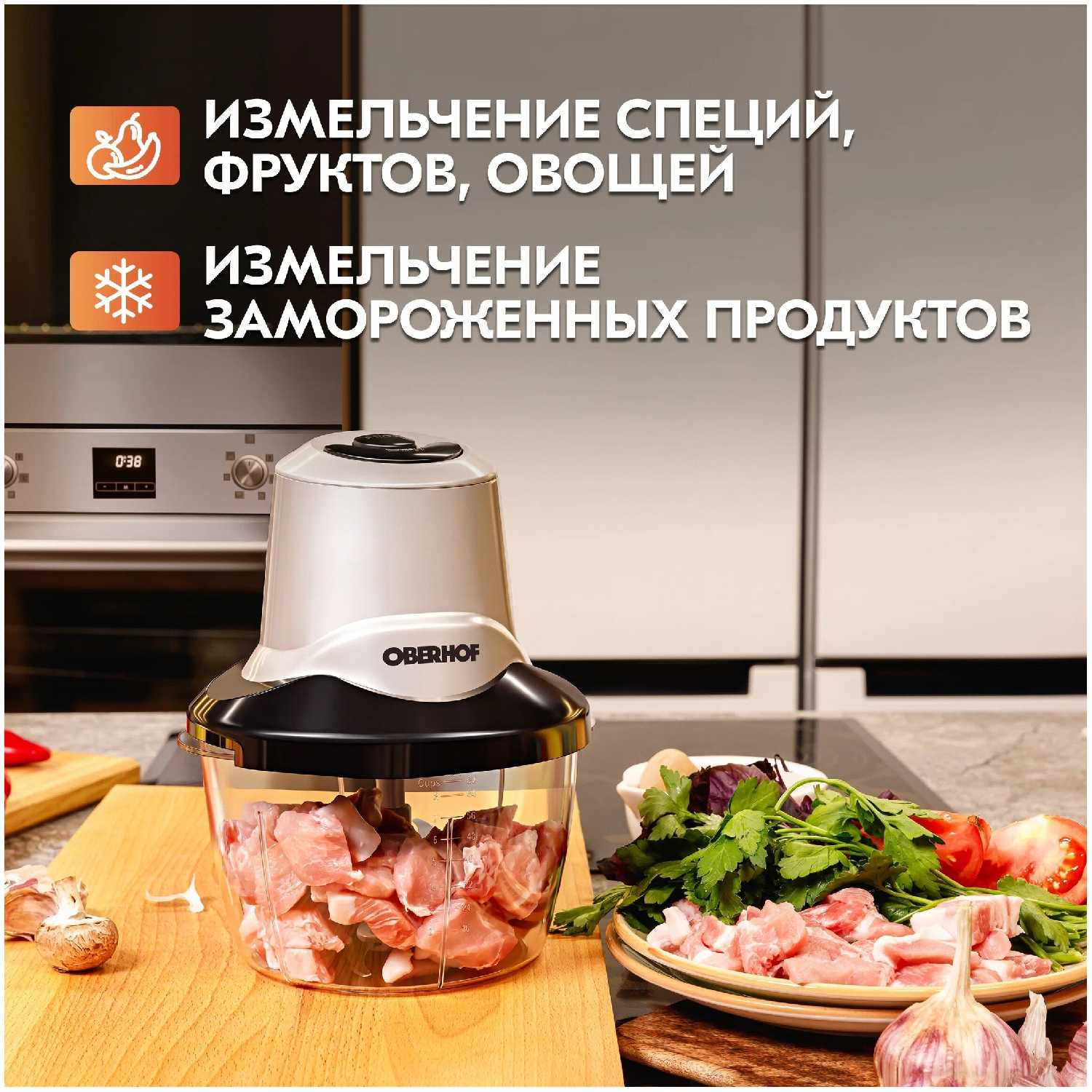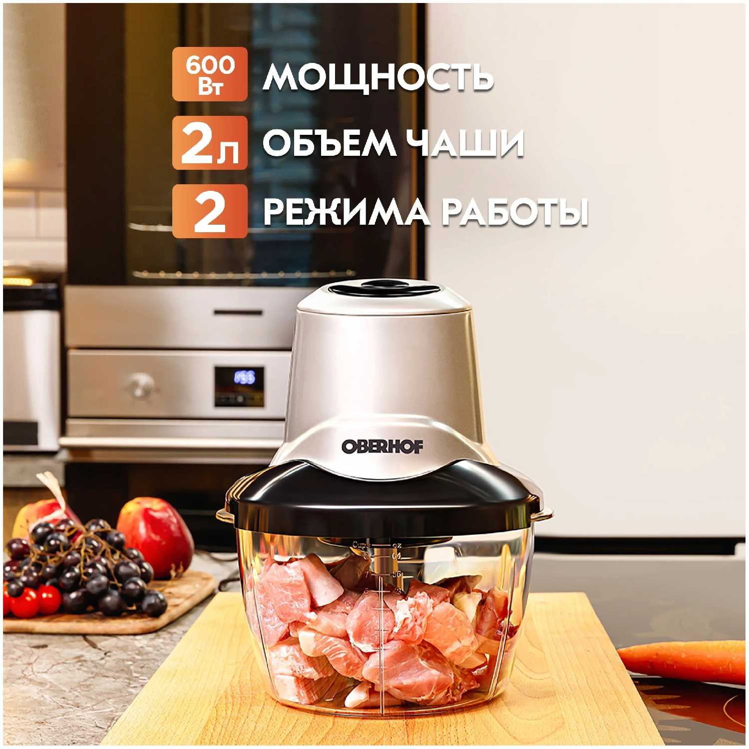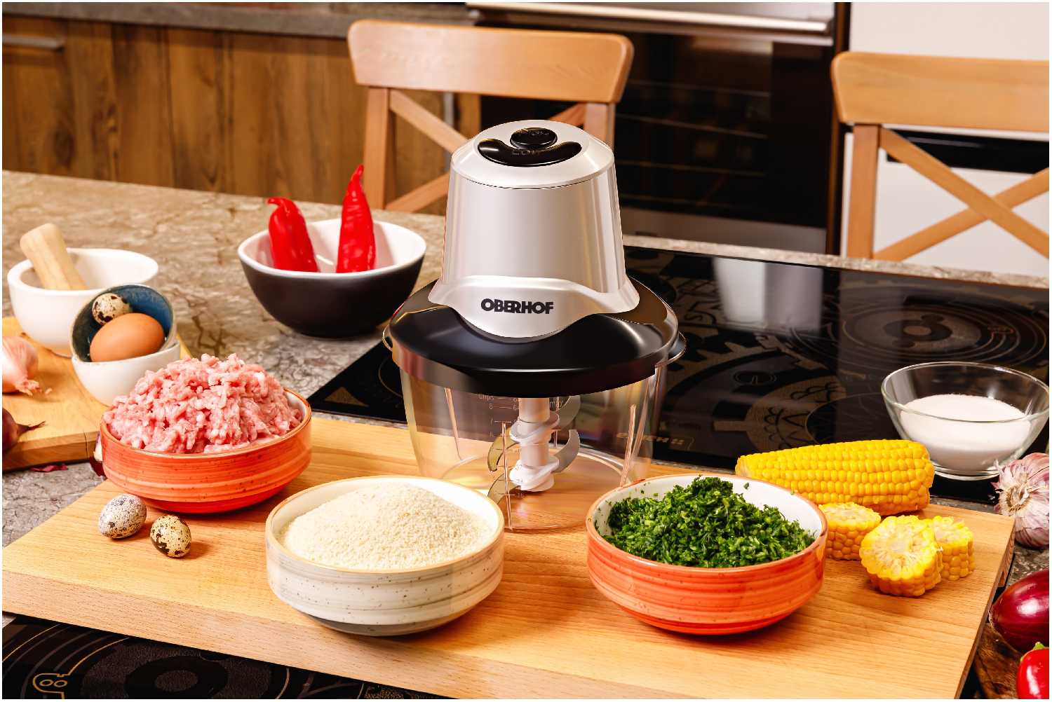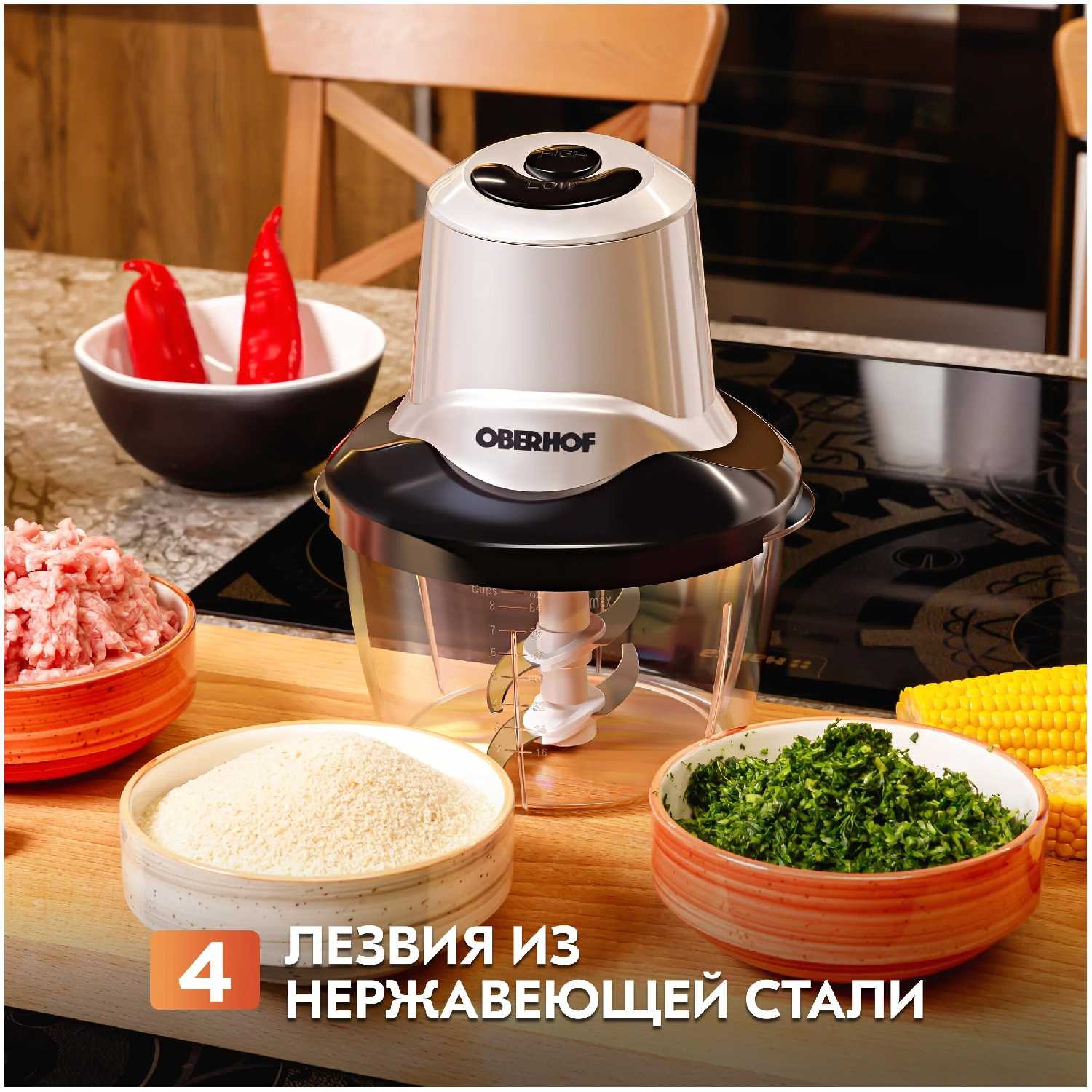 Очень советую, та как измельчитель Oberhof: не перегревается во время работы (и не загорается!); стальные ножи работают исправно; частички пищи не прилипают к деталям; рабочая чаша основательно прочная; справляется с крупными кусочками; вмещает несколько кухонных приборов – миксер, блендер, мясорубка; быстро измельчает для нужной консистенции; инструкция проста и понятна.