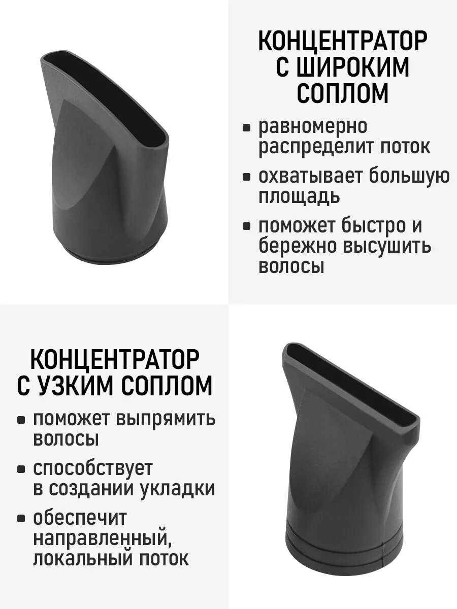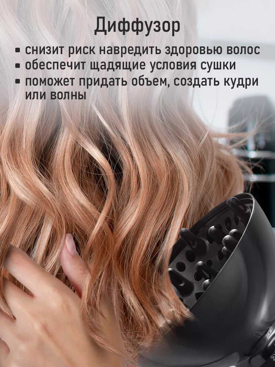 - Насадки включают концентратор и диффузор, позволяя создавать разные стили от прямой сушки до объемной укладки для кудрей.