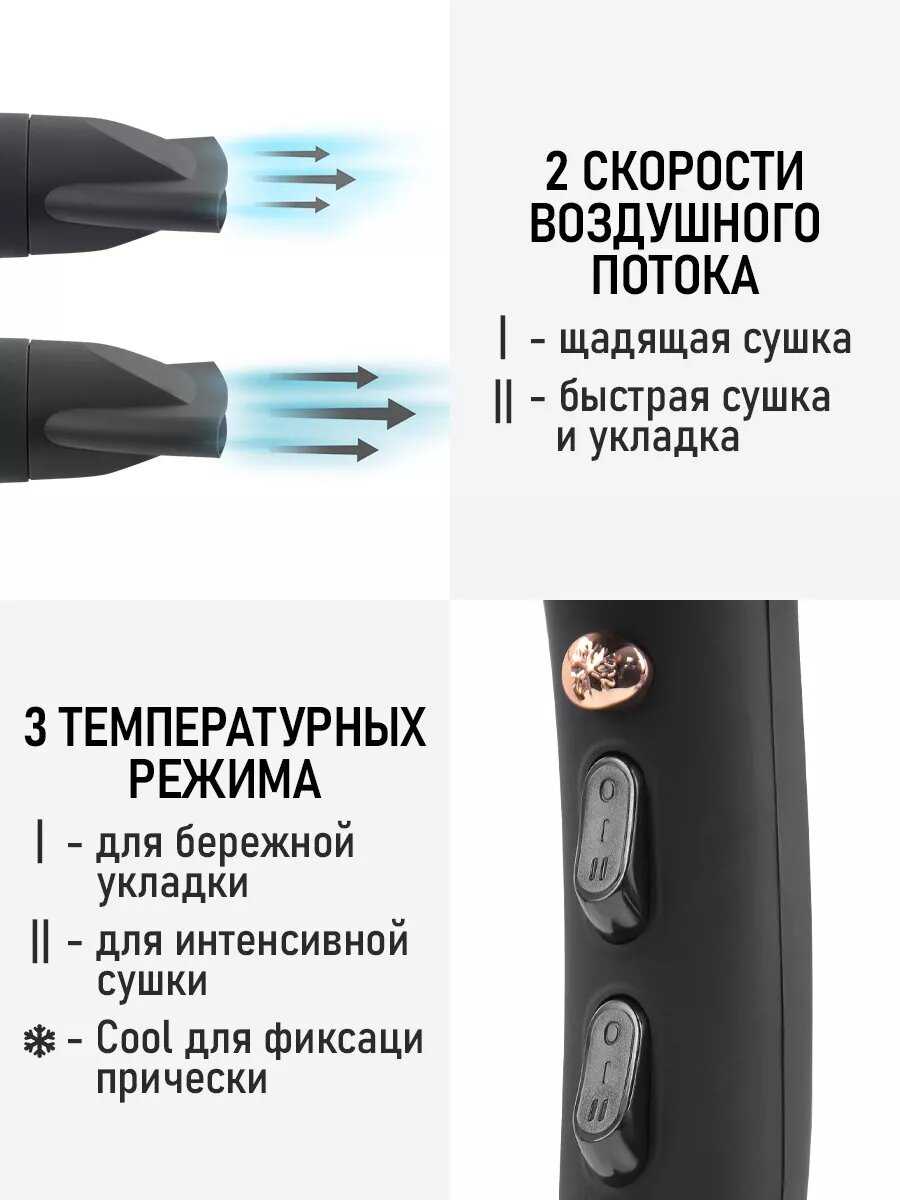Фен оснащен тремя температурными режимами и несколькими скоростными настройками, что подтверждается многочисленными отзывами. Переключение между режимами осуществляется легко, без заеданий, что отмечают пользователи. Наличие функции холодного обдува особенно выделяется в отзывах - он действительно холодный, а не теплый, что важно для фиксации укладки. -
