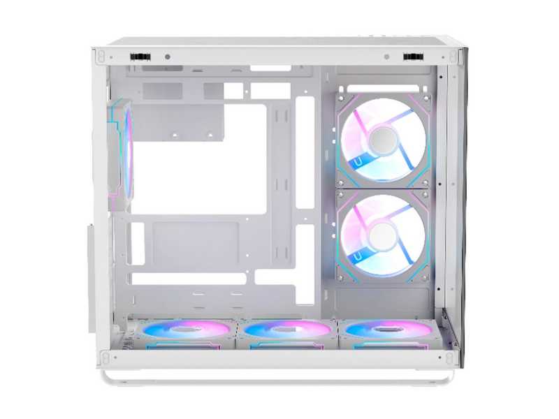 Отличный корпус за свою цену. При цене в 9к в комплекте идет 6 вентиляторов с красивым эффектом «бесконечности». Поставил в него мать ATX. Снизу для проведения проводов места не осталось, но из-за нижних вентиляторов проводов все равно не видно, так что это не проблема. Боковые стекла и стенки снимаются без проблем. Ножки корпуса смотрятся интересно, лучше, чем на фотках. Корпус стоит на них уверенно, не шатается. Спереди корпуса есть экранчик, на который с помощью ПО корпуса можно вывести температуру процессора или видеокарты. Также на корпусе есть кнопка переключения режимов подсветки, которых достаточно много и большинство из них выглядят отлично. Сверху получилось установить водянку Arctic Liquid Freezer III 360, у которой очень толстый радиатор по сравнению с другими СЖУ.