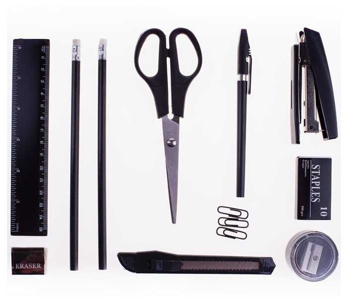 В наборе : | скобы для степлера, ластик, скрепки канцелярские, линейка, карандаш, ножницы, нож канцелярский, ручка, точилка, степлер |