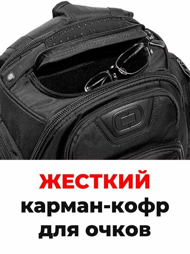 - + Очень вместительный рюкзак! Прочный и «сухой» футляр для очков, под очки любого размера, кроме мотокроссовых и горнолыжных. Удобная спина, вмещается ноутбук 17’’ (диагональ 43см)