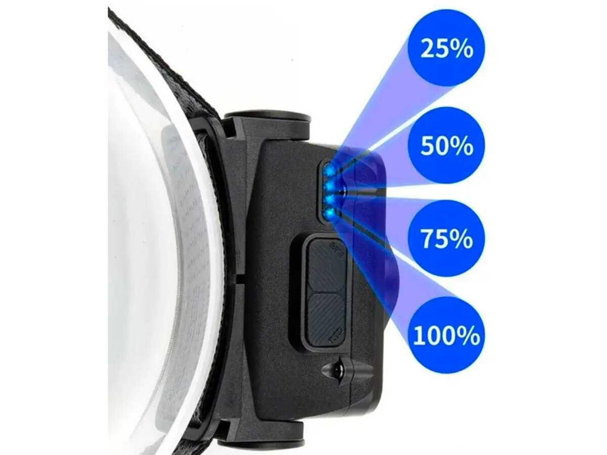 - + Фонарь выглядит футуристично - !!!космический дизайн!!!, четыре светящиеся синим светом индикатора-светодиода отражают зарядный процесс наполнения аккумулятора(аккумуляторов. Не знаю сколько их, пока ещё не разбирал фонарь, но разберу, об этом, в недостатках...). 5 режимов освещения(два белый свет: яркий и менее яркий., два красных света: яркий и менее яркий, не ясно для каких целей, но может найдут себе применение., и мигающий красный: наверное этот режим будет актуален для водителей, "застрявших" ночью на дороге, по причине поломки авто(проезжающих мимо, наверняка, привлечёт внимание данный режим мигающего света!!!, типа, "режим-авария"). Приятно тактильная прорезиненная кнопка включения и переключения режимов освещения, не щёлкает громко и в то же время понятно, что нажатие сделано! USB Type-C универсален, в комплекте шнур достойного качества(длина 30см.). Разъём для подключения зарядного кабеля закрывается хорошо резиновой заглушкой(думаю, что фонарь можно погружать в воду на короткое время, но погружение, более чем на метр в глубину, наверное не лучшая идея.). Ремешок оголовья имеет ширину 25мм и вполне качественный (не тонкий).