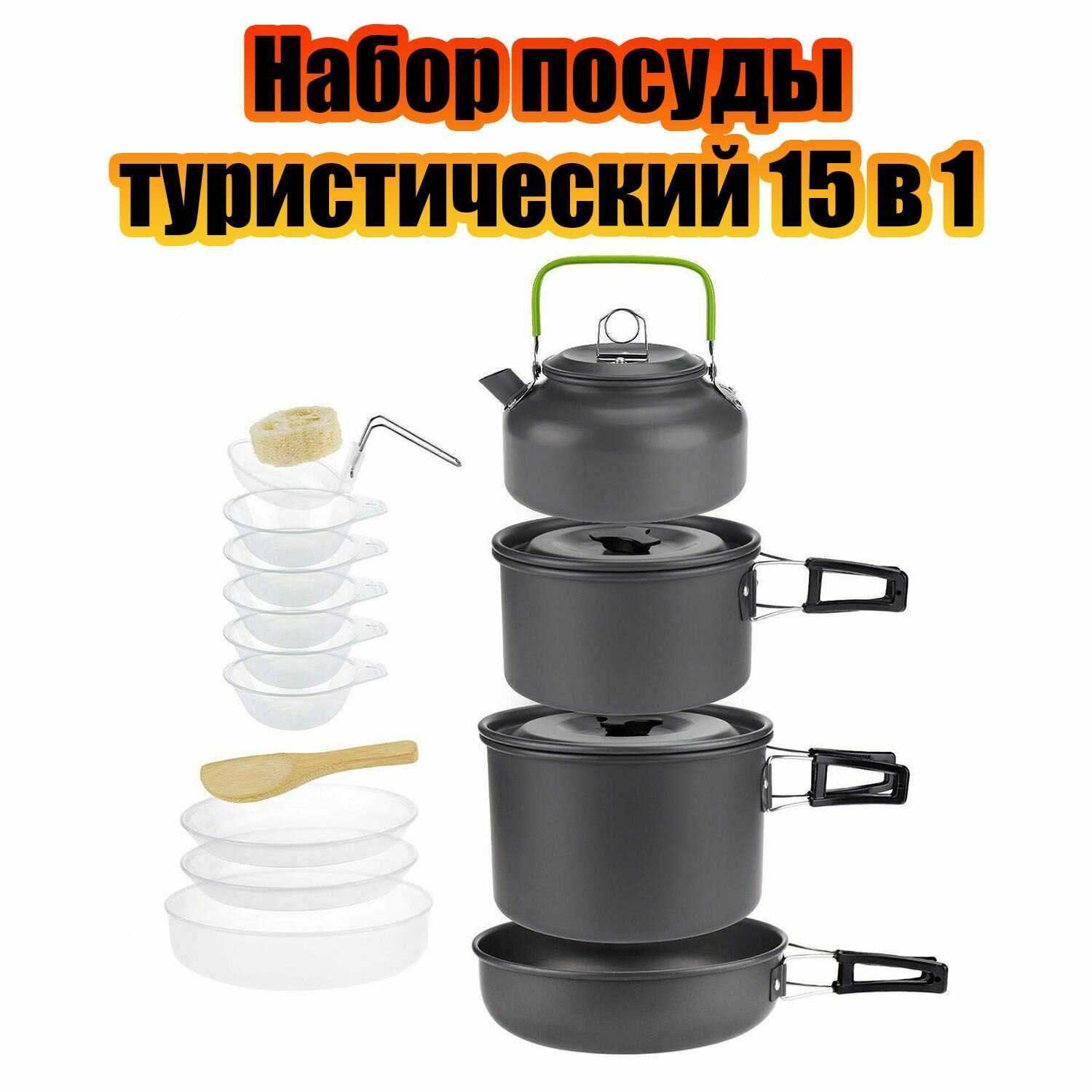 Покупался набор исключительно из-за компактности посуды (сковорода, кастрюли, чайник). В целом всё не плохо, есть 4 набора складных столовых приборов (ложка, вилка,нож+ 1 половник)). Зачем-то 5 мелких мисок(подойдут под соус для шашлыка вприкуску, но зачем 5 штук?)))), Две не глубокие пластиковые тарелки, одна глубокая. Не понятен принцип количества тарелок, при учёте столовых приборов на 4 персоны))))
