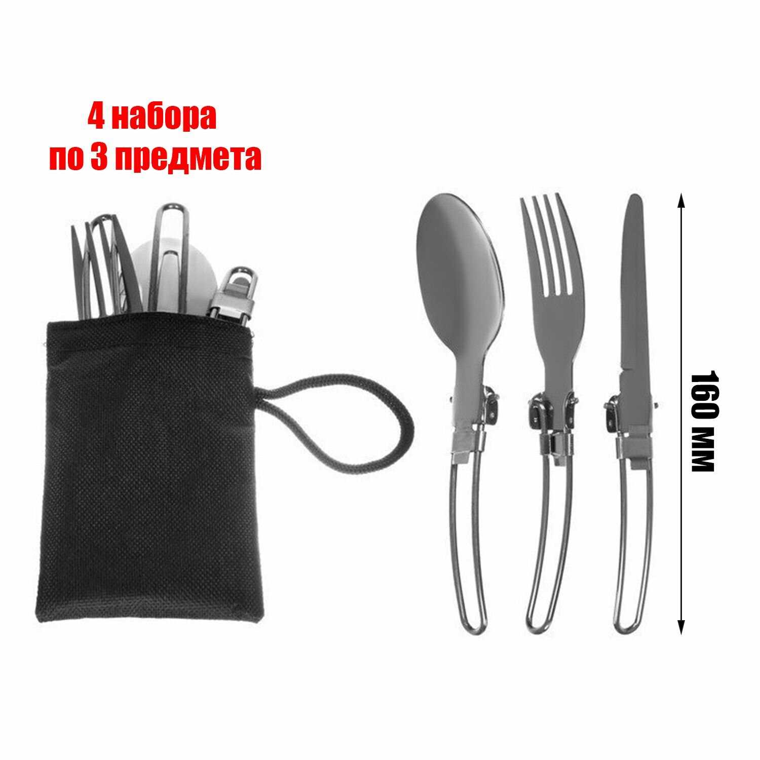 Покупался набор исключительно из-за компактности посуды (сковорода, кастрюли, чайник). В целом всё не плохо, есть 4 набора складных столовых приборов (ложка, вилка,нож+ 1 половник)). Зачем-то 5 мелких мисок(подойдут под соус для шашлыка вприкуску, но зачем 5 штук?)))), Две не глубокие пластиковые тарелки, одна глубокая. Не понятен принцип количества тарелок, при учёте столовых приборов на 4 персоны))))