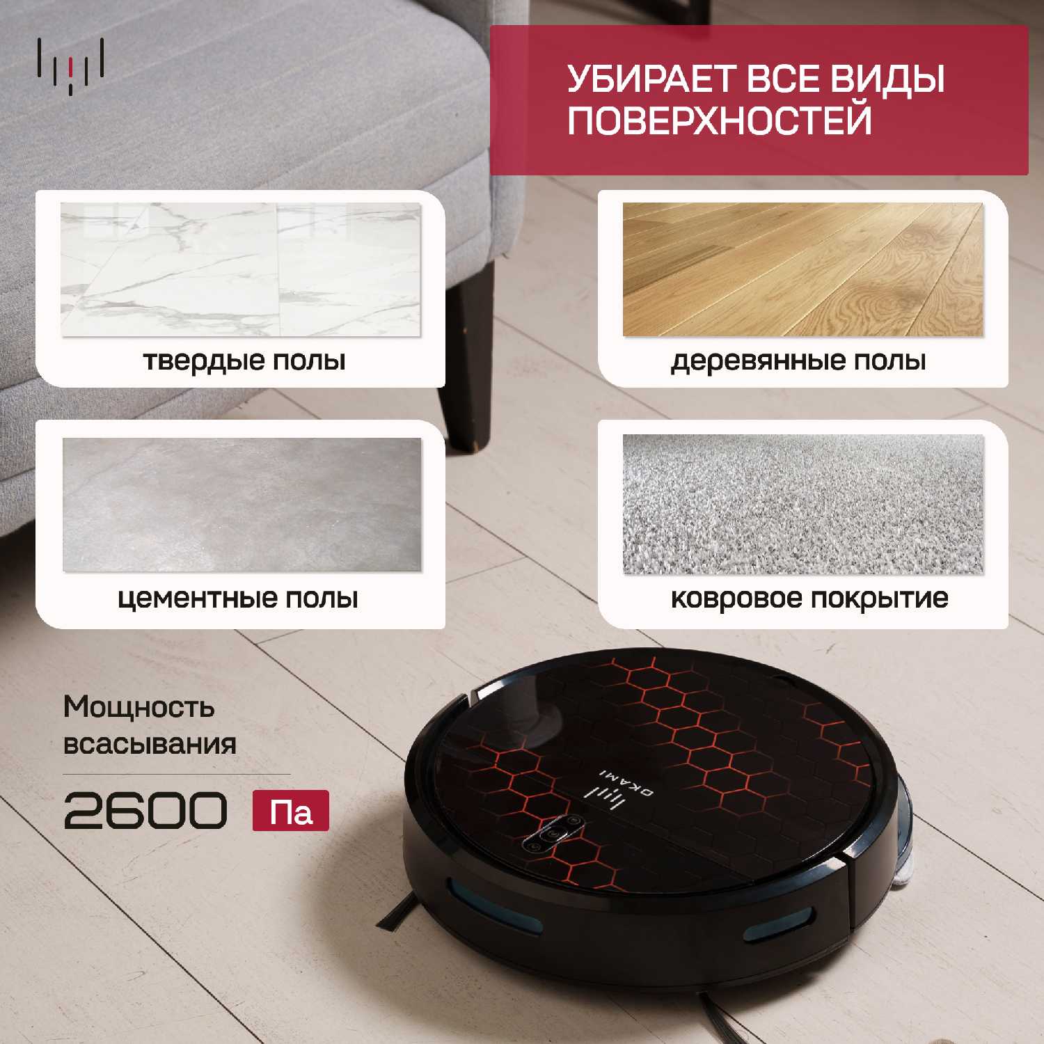 - Заряда хватает на сухую уборку 60-100 кв.м за один цикл, включая локальные зоны.