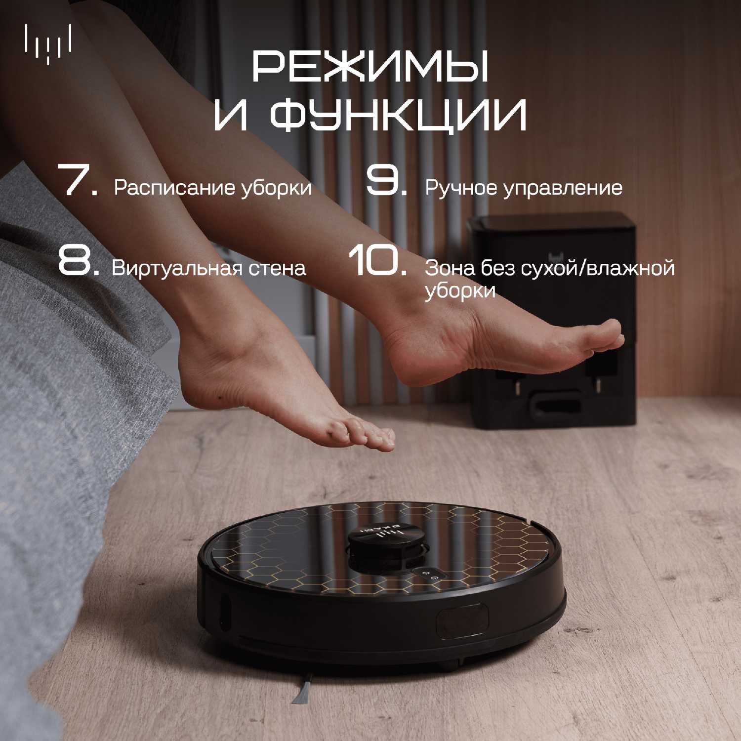 - Функция возобновления уборки с места остановки после подзарядки гарантирует полную очистку всей заданной площади даже в больших квартирах.