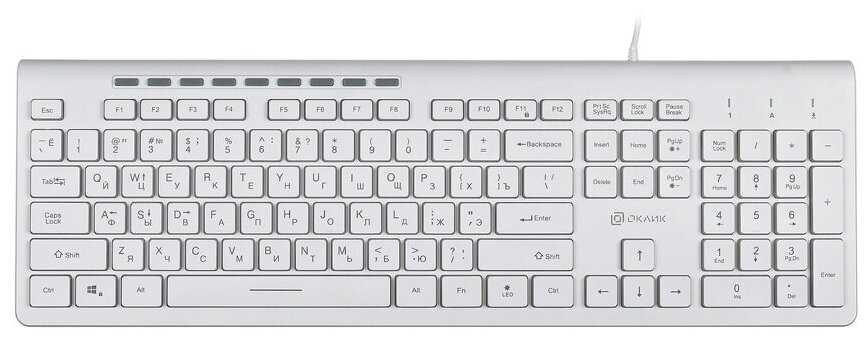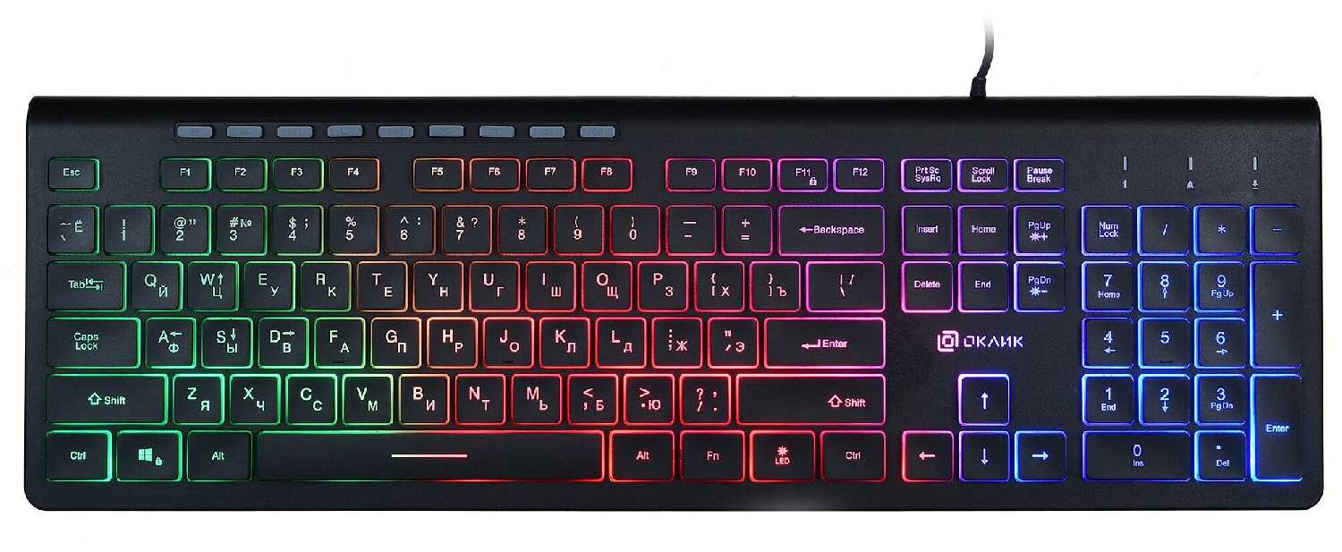 - Полноразмерная раскладка с индикаторами Num/Caps/Scroll Lock: