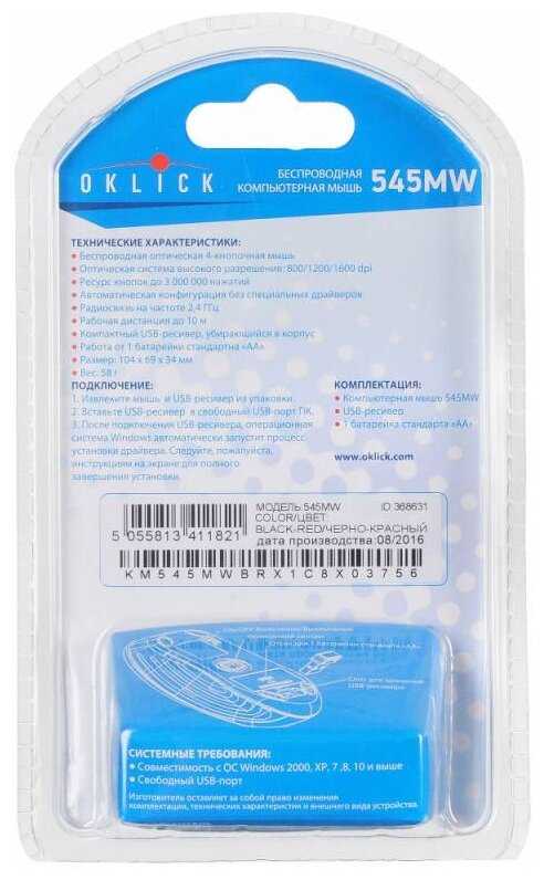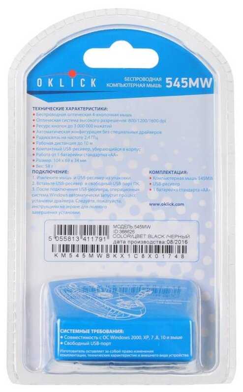 Профессиональный опыт использования беспроводной мыши OKLICK 545MW Black был просто отличным! Удобная форма, отличное качество сборки и быстрая беспроводная связь делают эту мышь идеальным выбором для работы и игр. Рекомендую всем!