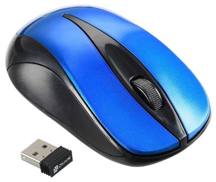 - + Беспроводная мышь OKLICK 675MW в сине-черном корпусе. В руке лежит удобно, кнопки мягкие. Без коврика хорошо ездит по полированному столу.