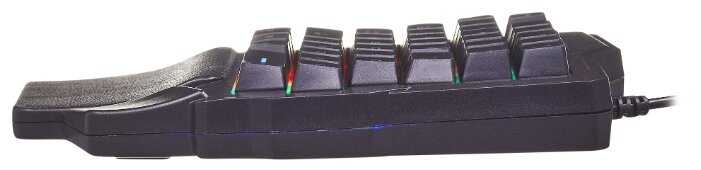 - + Отличная игровая клавиатура для всех, кто любит играть в компьютерные игры. Достаточно удобная, с большими клавишами, не занимает много места. Обладает яркой подсветкой, позволяющей играть в полной темноте. Содержит набор клавиш, находящихся с левой стороны обычной клавиатуры (именно там находятся хоткеи, используемые в играх). Клавиатура также имеет удобную подставку, благодаря которой рука не устает и не перенапрягается во время долгой игры.