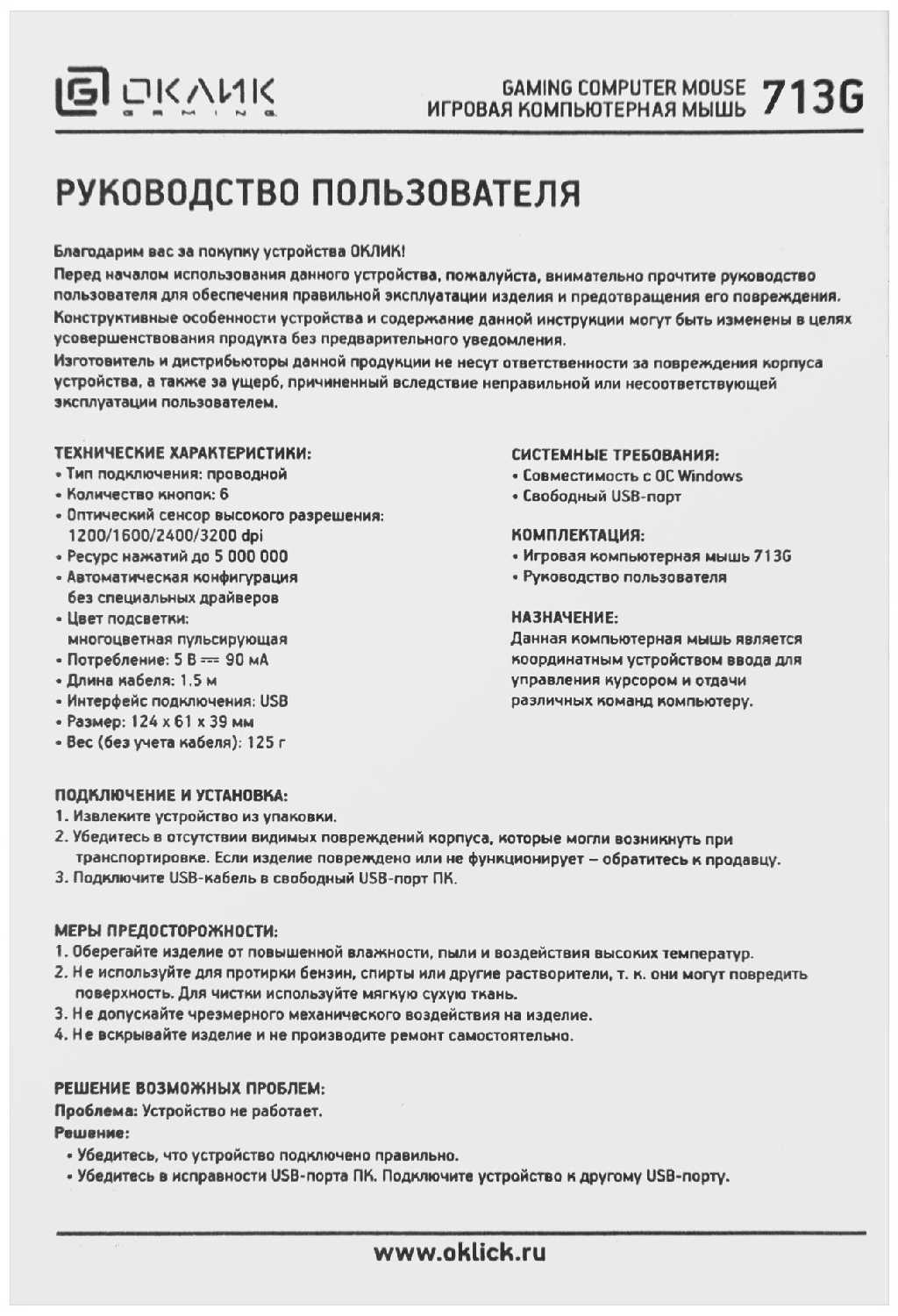 | Комплектация : | Игровая компьютерная мышь 713G, Руководство пользователя |