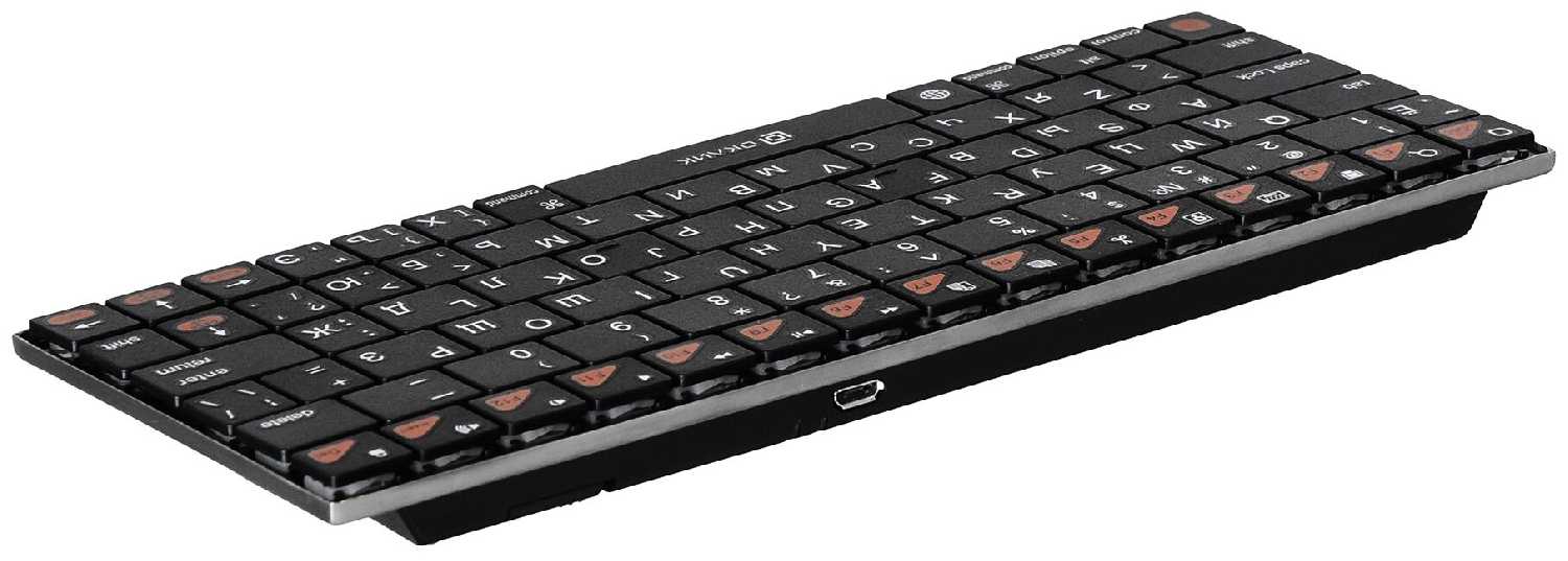 - + Встроенная литиевая батарея, красивый внешний вид, USB кабель для зарядки в комплекте. Есть отдельная клавиша для переключения языка (точно работает в Windows 8)