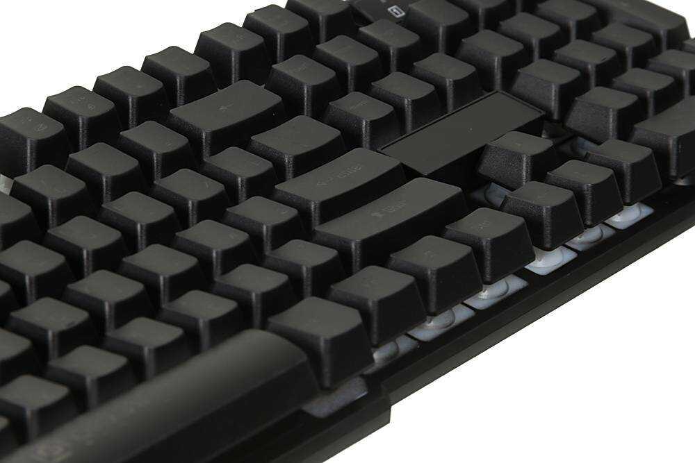 - + Клавиатура с подсветкой. Выглядит прикольно. Некоторые пишут что для игр слишком легкая. Мне для игр она подошла, по столу не скользит.