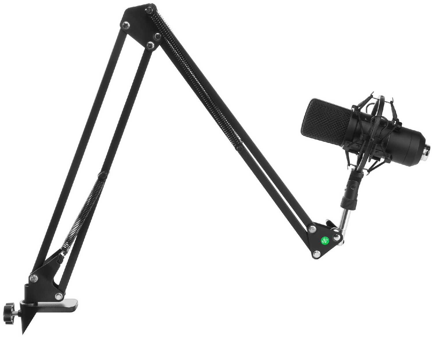 - Металлический пантограф с гибкой шейкой позволяет настраивать высоту и угол наклона микрофона одной рукой.