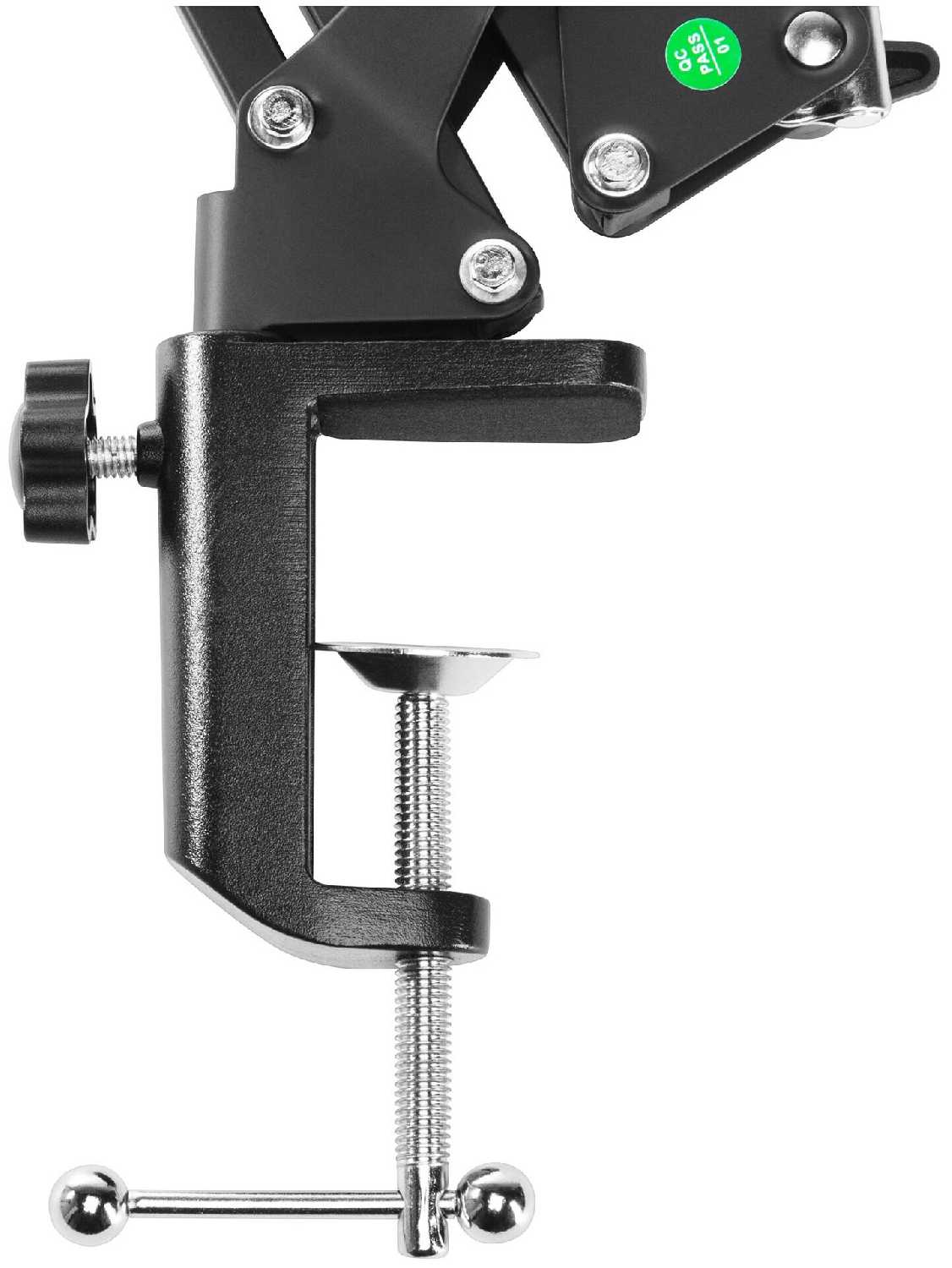 Струбцина обеспечивает устойчивую фиксацию на столешнице толщиной до 4 см, а мягкие прокладки предотвращают скольжение. Но при частой регулировке высоты пантографа крепежный винт может ослабляться, из-за чего микрофон иногда резко опускается. Для стационарного использования это не критично. -