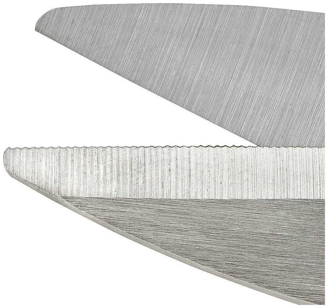 Ножницы демонстрируют выдающуюся режущую способность благодаря уникальной конструкции: одно полотно оснащено серрейторной насечкой, которая исключает соскальзывание материала даже при работе с плотными или скользкими поверхностями. Пользователи отмечают, что инструмент справляется с толстыми ногтями, тканями (без образования затяжек или надрывов), кожей, картоном и другими материалами. При этом рез остается ровным, несмотря на опасения о возможной «волнистости» из-за зубчатого края. Важно, что острота сохраняется по всей длине лезвия — даже кончиком можно выполнять ювелирные разрезы. Однако провода резать не рекомендуется: это может повредить заточку.