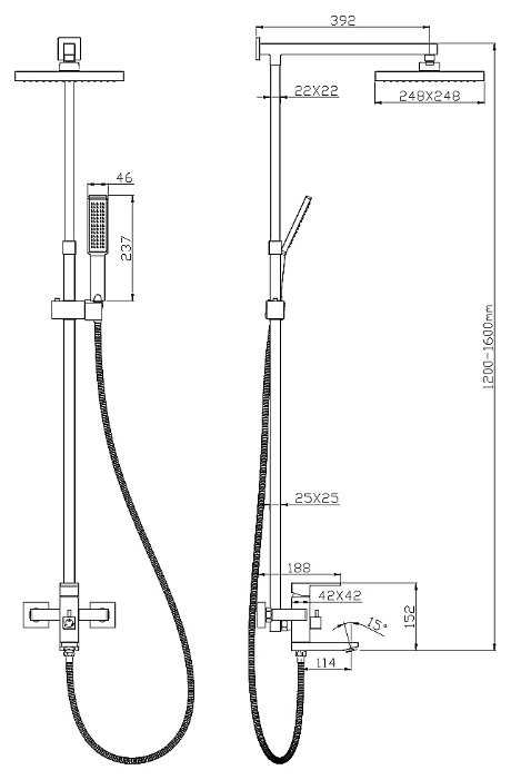 | Дополнительная информация : | высота стойки для душа 1200-1600 мм, длина-ширина верхнего душа: 248x248 мм |