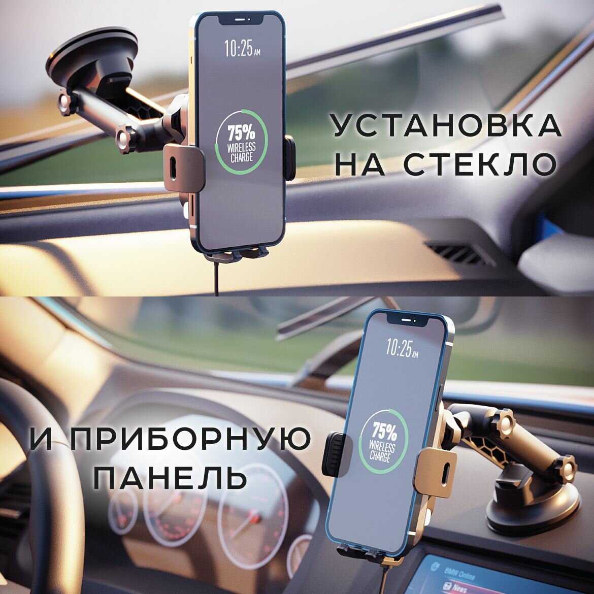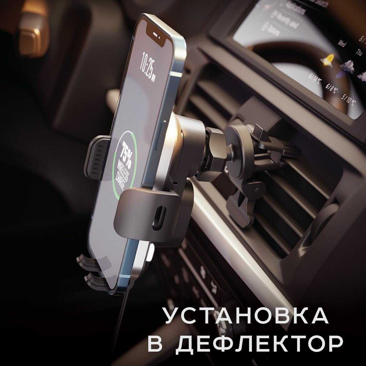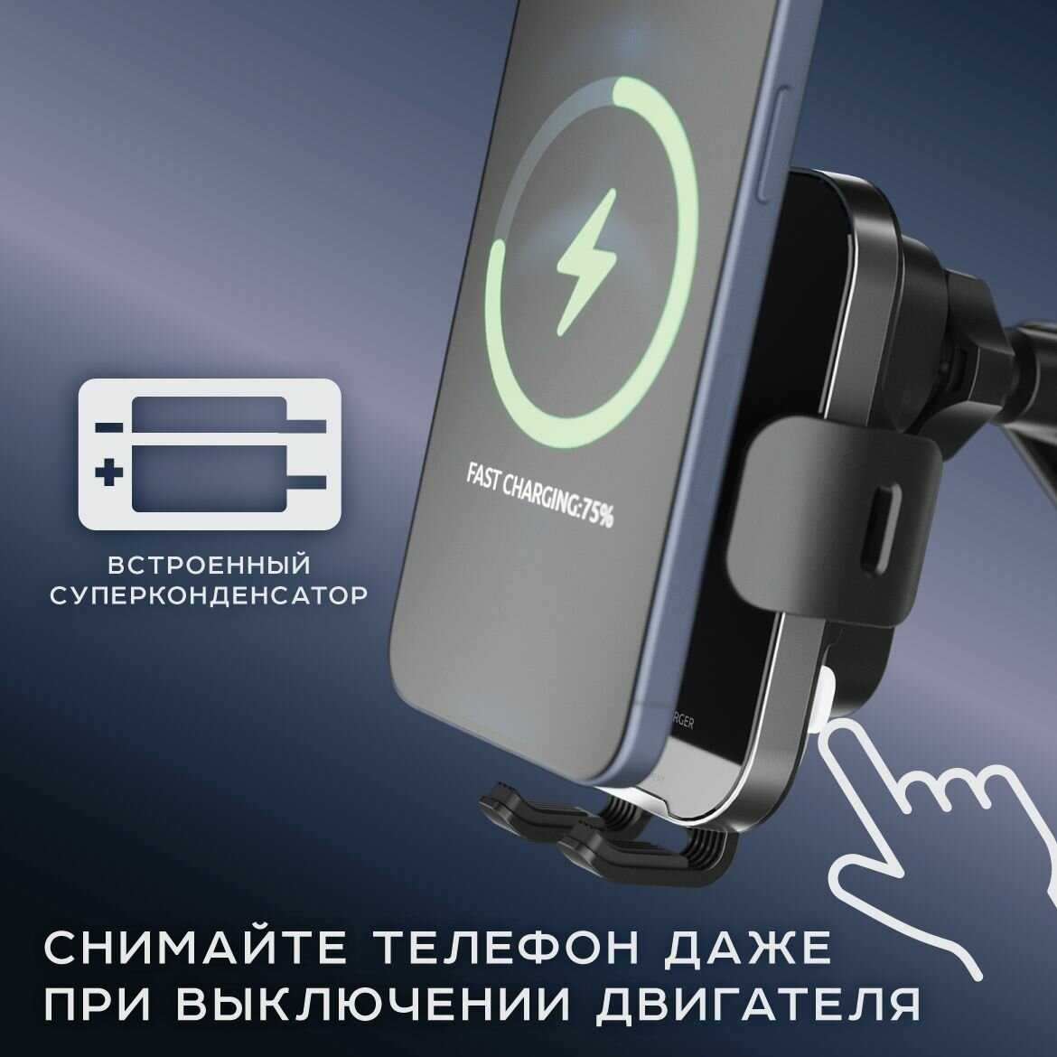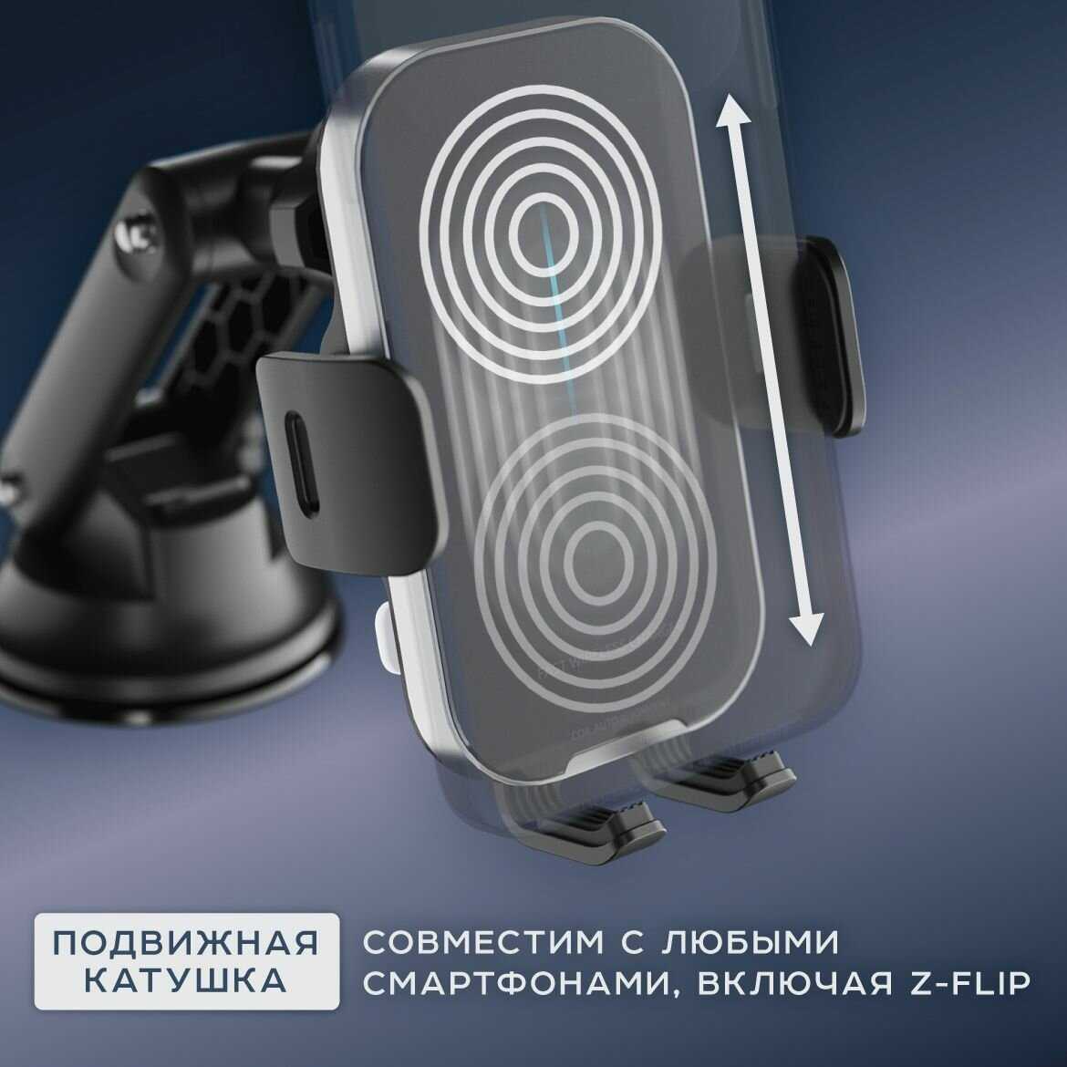 - + довольно компактный держатель для телефона, при подключении кабеля к держателю быстро подстраивается под габариты телефона , надежно его держит. Заряжает телефон через проводную зарядку сравнительно быстро.