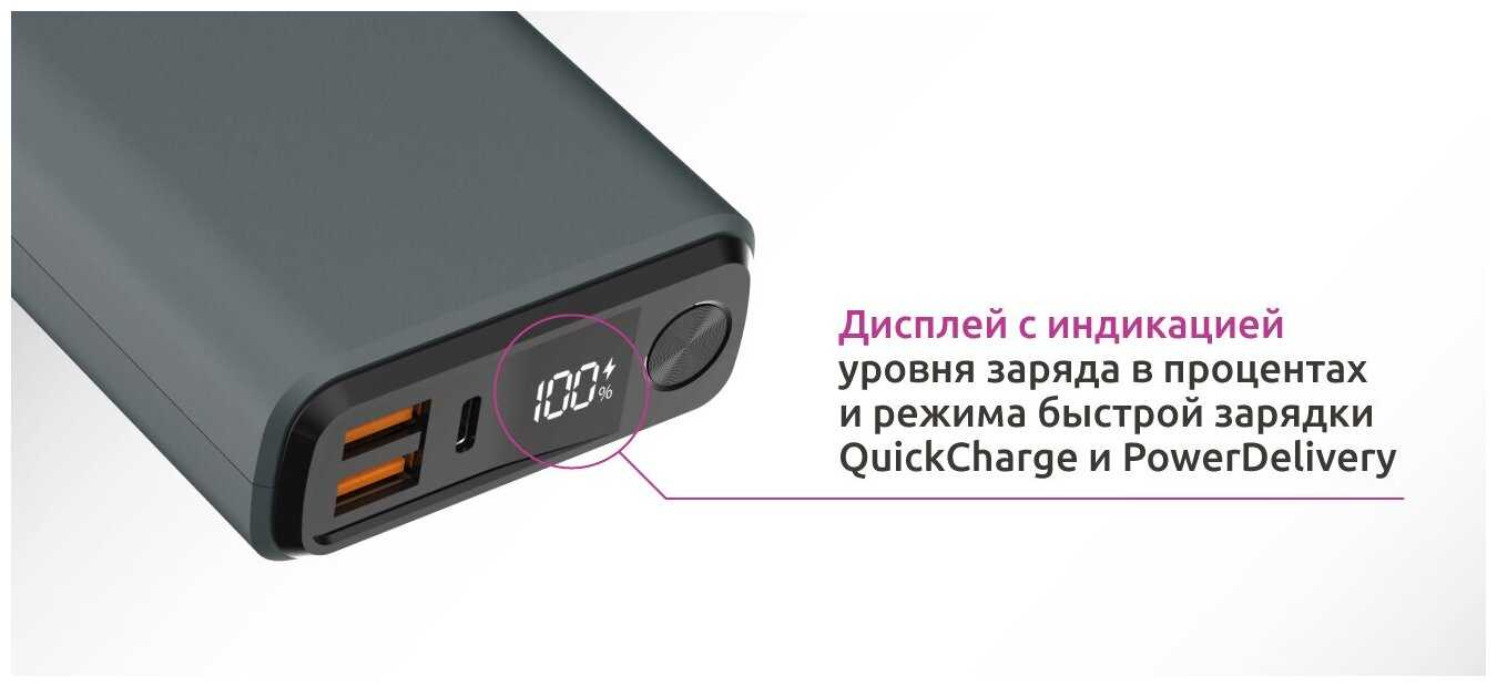 - Цифровой дисплей с отображением заряда в процентах позволяет точно планировать использование.