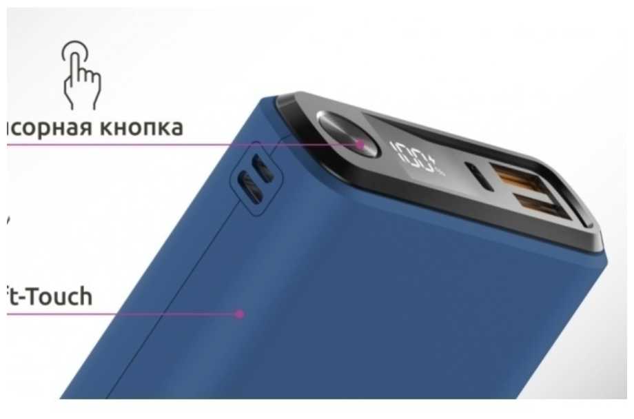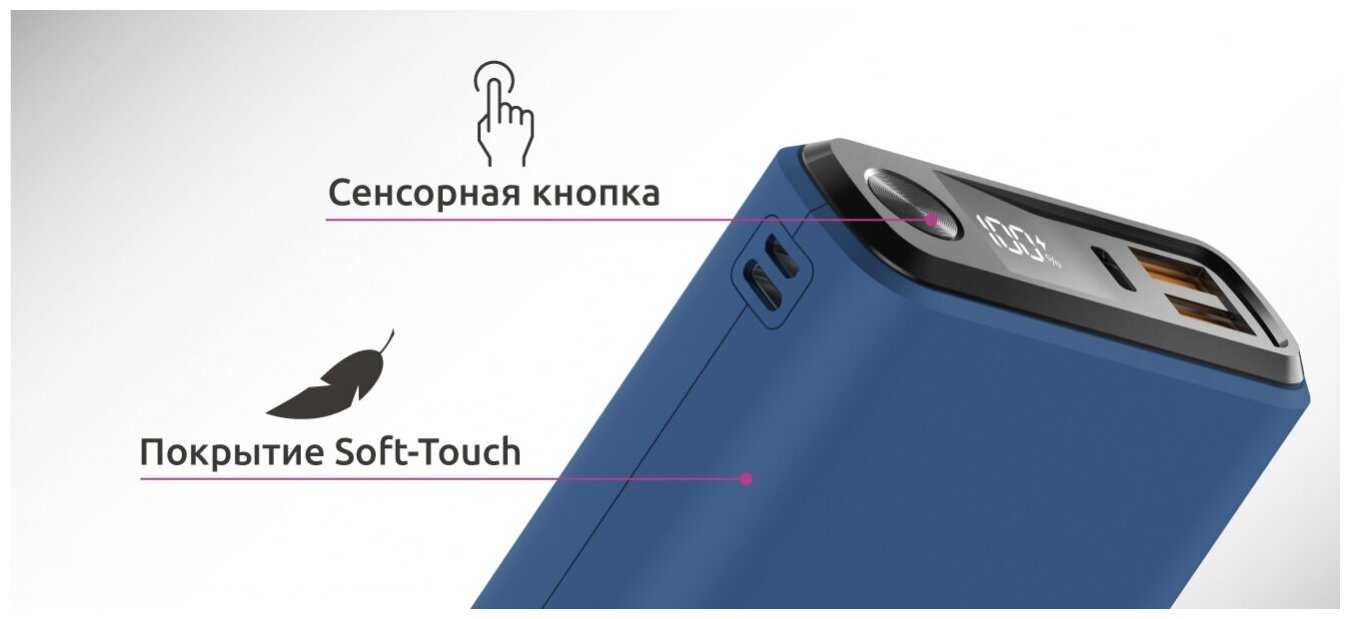 Сенсорная кнопка включения, точный цифровой дисплей (в процентах) и поддержка трёх типов кабелей (USB, Type-C, Lightning). Однако кнопка иногда срабатывает случайно при переноске в сумке.
