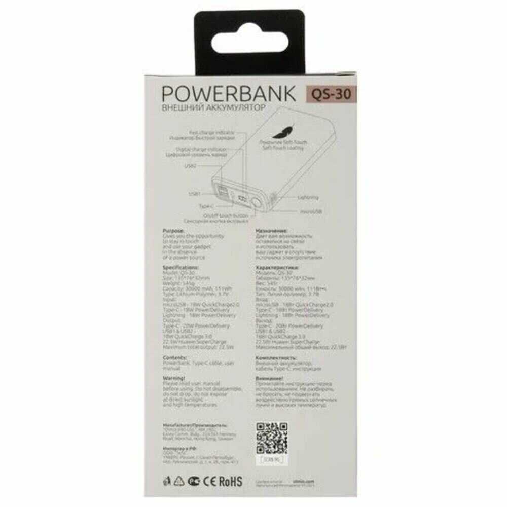 - USB-C работает в двух направлениях: для зарядки устройств и пополнения энергии самого power bank.