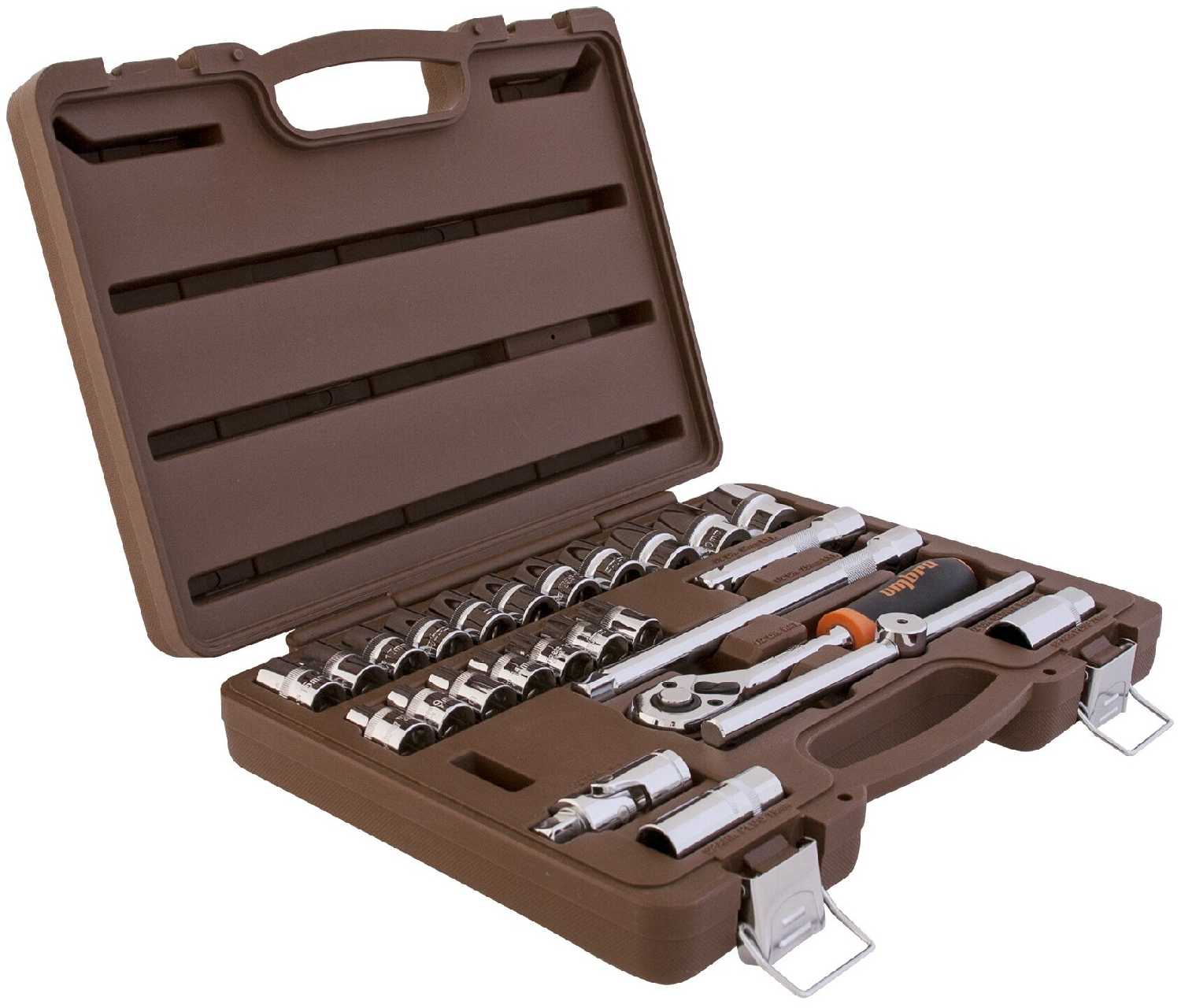 Качественный инструмент, металл даже наощупь чувствуется качественный, трещотка имеет кнопочный фиксатор от падения головок, в наборе представлены самые их ходовые размеры, а также рациональный набор удлинителей, воротков и других приспособлений для уверенной работы с автомобилем, дома или в гараже.
