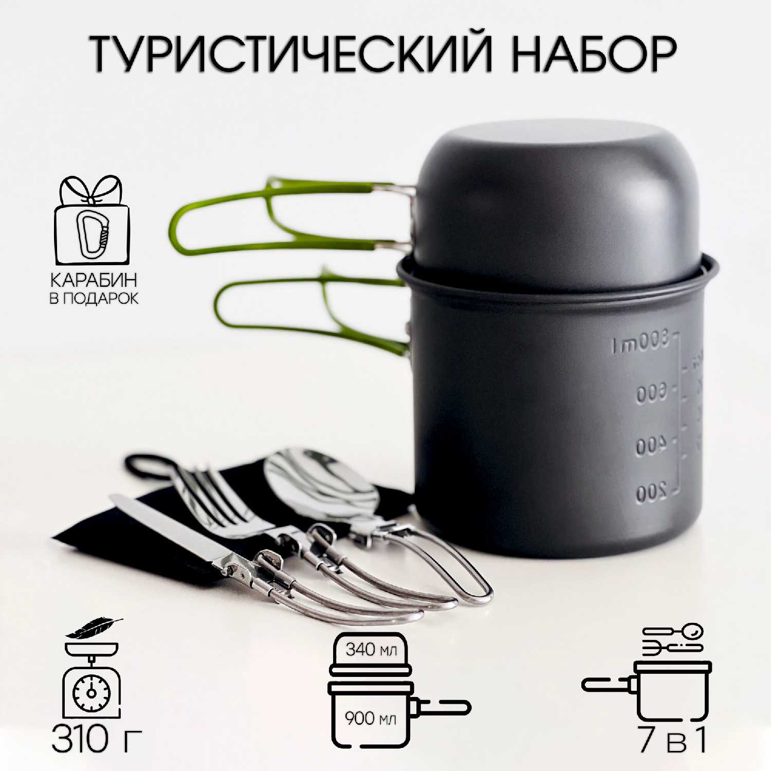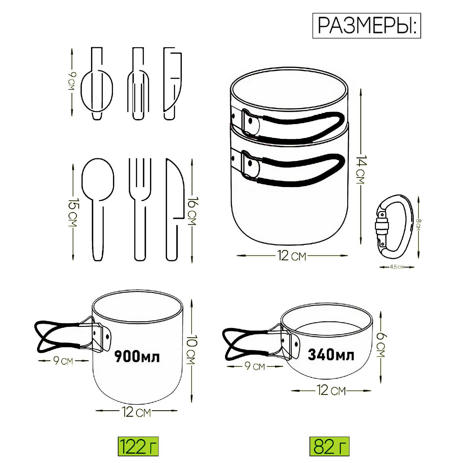 - + Норм приборы. С виду вилки ложки казались хлипкими, но нет, отличные. Котелочек маленький под горелку на 800 мл и ёмкость чуть меньше.