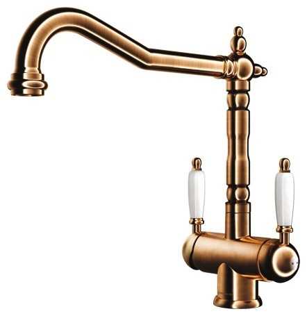 - + Стильный смеситель под старину, удобные ручки, плавный ход вентилей, возможность подключения фильтра для питьевой воды
