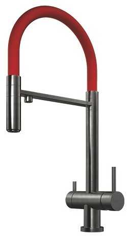 Классный смеситель, идеален для мытья большой посуды за счет нормальной длины излива (23 см), аэратор мягко обогащает воду пузырьками – кран не брызгает, да и воды после замены смесителя стало уходить меньше. Сделан из латуни, так что если верить сантехнику, не заржавеет. Корпус покрыт напылением цвета вороненая сталь, мне понравилось больше просто черного, смотрится необычно особенно рядом с красным изливом. К чему пришлось привыкнуть это к боковому рычагу, немного неудобно после верхнего, но это дело времени.