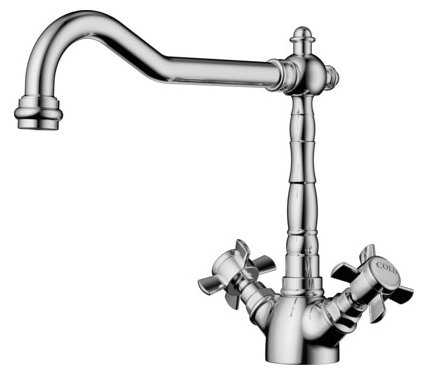 Очень оригинальный дизаайн этого смесителя. Мне сразу привлек внимание этот смеситель. У него хороший, верхний изгиб по которому течет вода. С двумя вентелями очень удобно в использовании, даже регулировать воду комфортно. Вентеля открывания и закрывания достаточно плавные, все на ходу, даже мокрыми руками удобно пользоваться. Смеситель сделан из качественной латуни, что уже говорит о его качестве. Все здорово с этим смесителем, все норм.